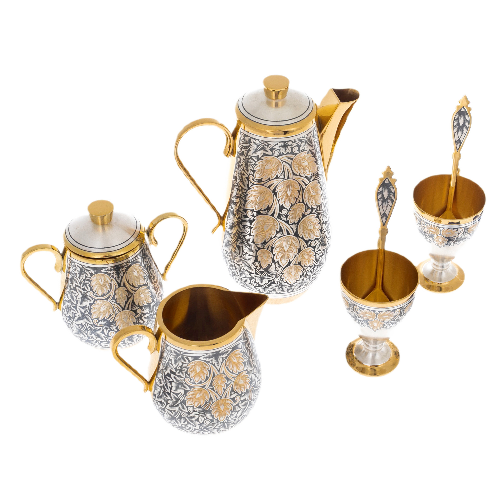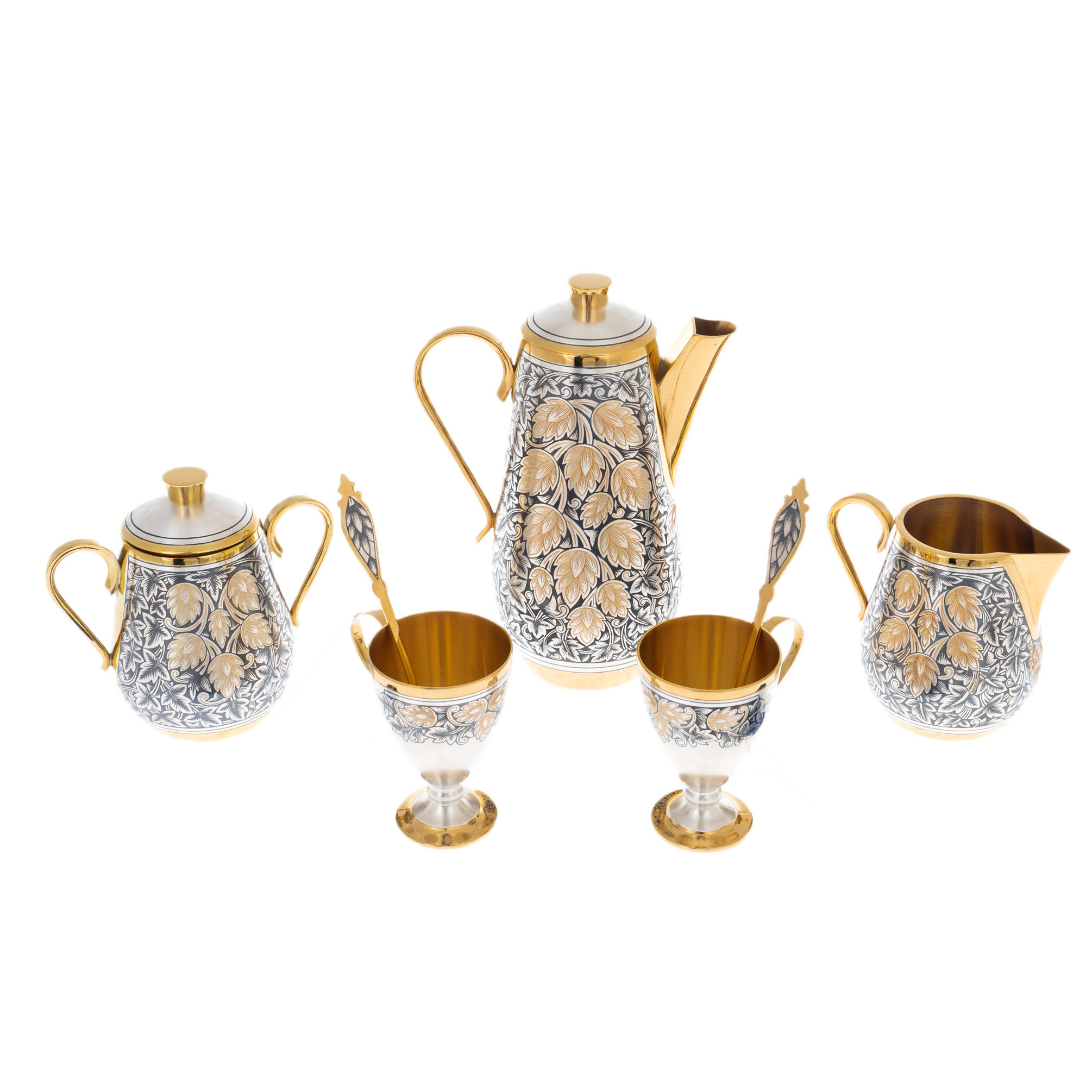 Кофейный набор из серебра "Хмель" — это и утонченный аксессуар для утреннего кофе, и символ вашей уверенности, силы и стремления к превосходству. Его изысканность и качество подчеркивают ваш вкус и статус, превращая каждую чашку кофе в ритуал, в котором соединяются искусство, традиции и сила духа. Этот комплект станет важной частью вашей коллекции, добавляя к ней элемент вечной элегантности и силы, которые всегда остаются на пике.