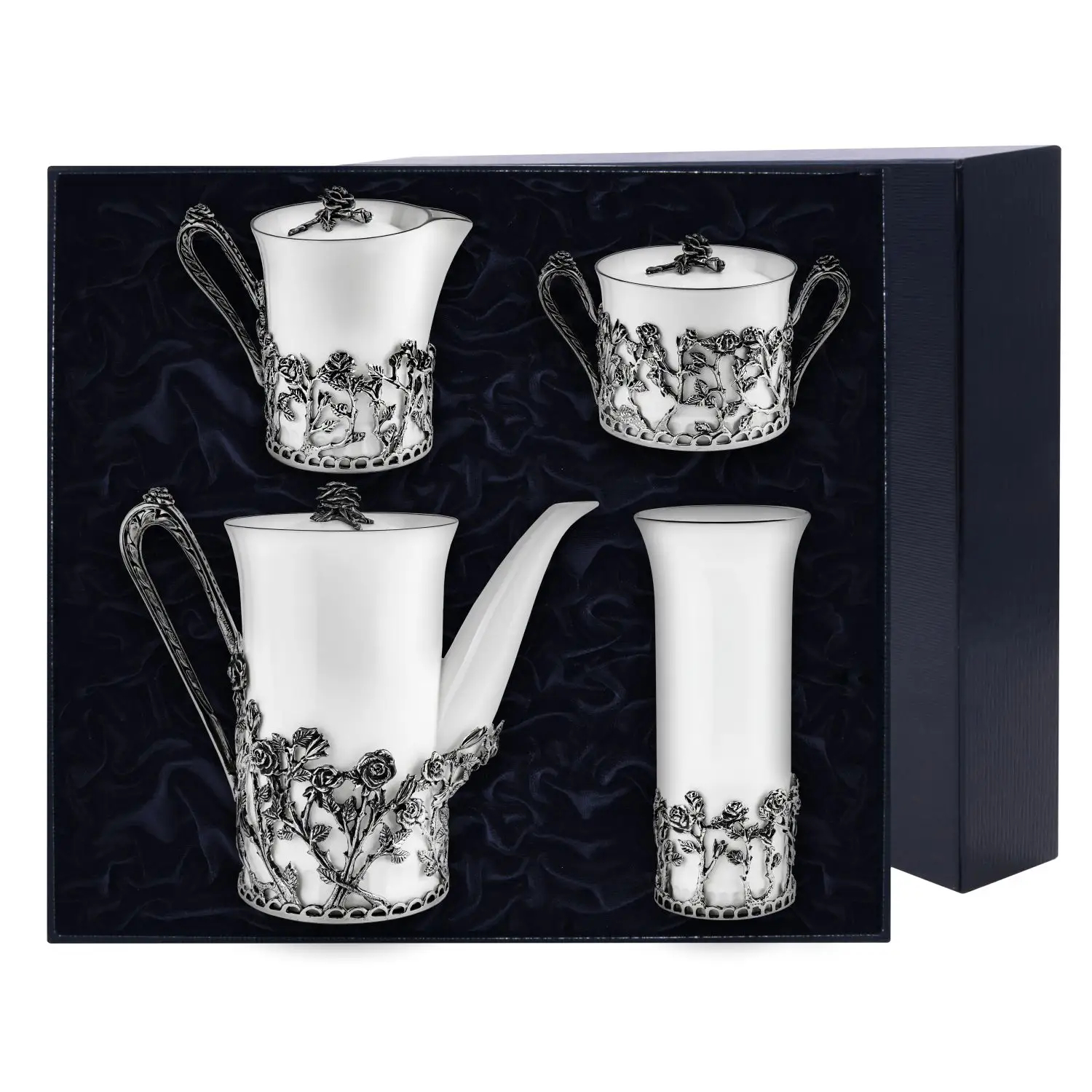 Серебряный набор для кофе "Розалия": ваза, кофейник, сахарница, сливочник