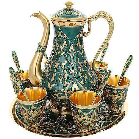 Кофейный сервиз из серебра «Восточный» — это не просто столовый гарнитур, а чувственный ритуал, облачённый в золото и изумруд. Комплект состоит из кофейника, шести чашек с ложками и подноса, образующих монолитную композицию, словно перенесённую из убранства султанского дворца. Каждая форма — обтекаемая, вытянутая, с утонченными изгибами и благородной тяжестью серебра, позолоченного изнутри. Предметы служат не только для подачи кофе, но и для демонстрации силы вкуса и безупречного выбора.