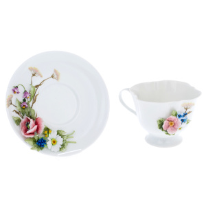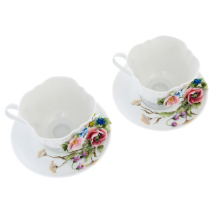 Фарфор, из которого изготовлен этот набор, напоминает хрупкость и в то же время прочность человеческих эмоций: словно символизируя тонкие нюансы утреннего пробуждения или душевных вечерних бесед, каждая чашка словно приглашает окунуться в атмосферу гармонии и красоты. Чашки и блюдце, украшенные ручной лепкой, вызывают ассоциации с цветением чувств, когда каждый лепесток будто бы хранит мгновение тёплой радости и нежности.