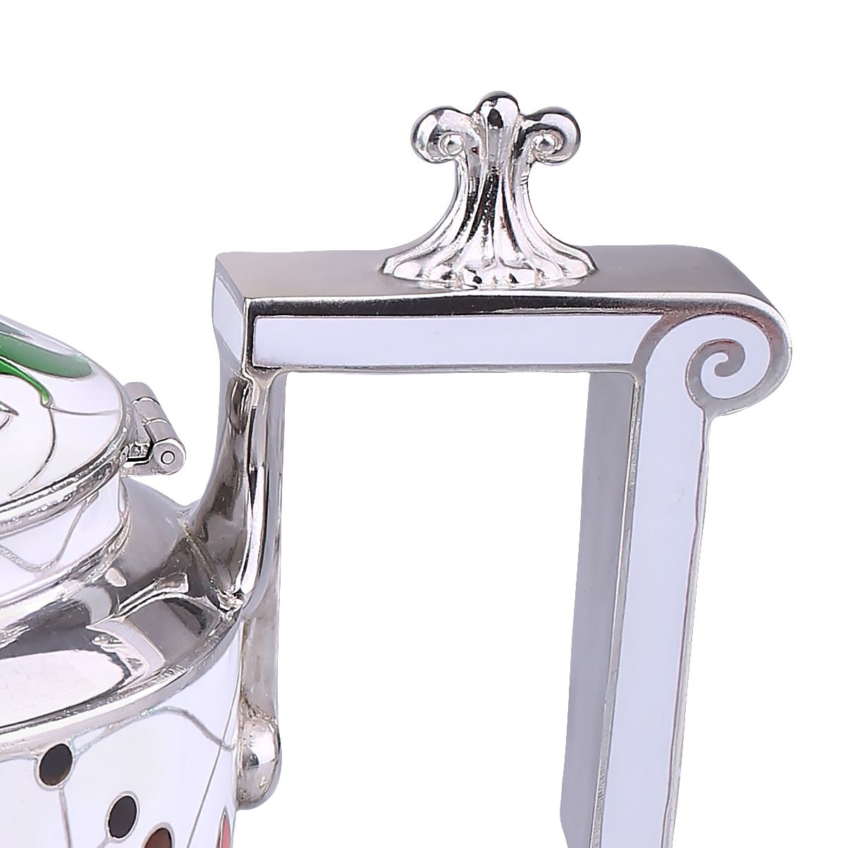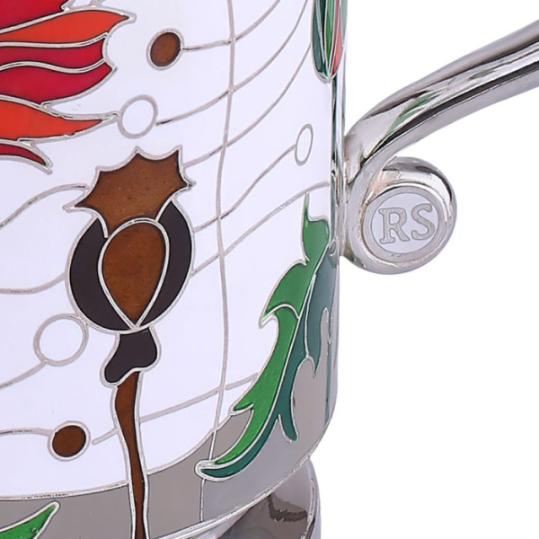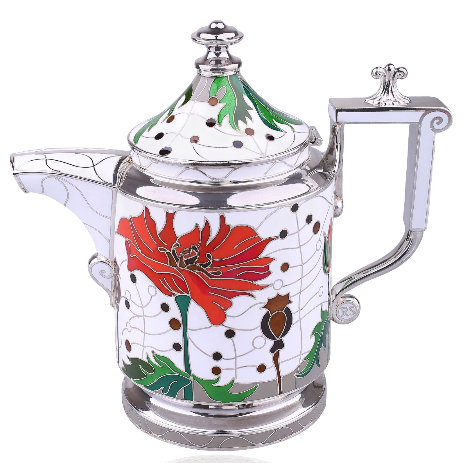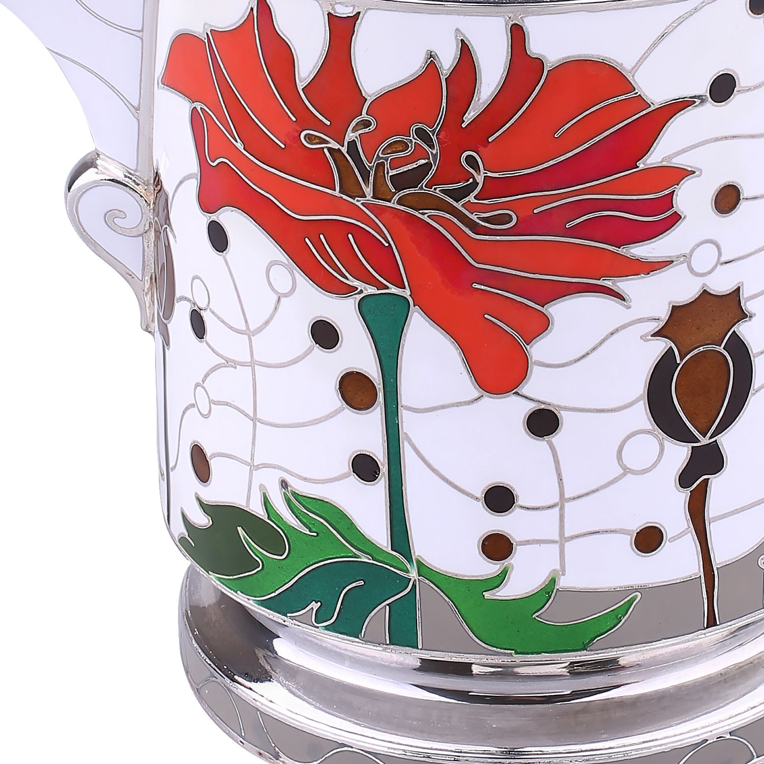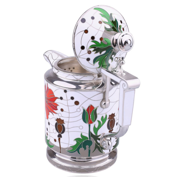 Серебряный сливочник "Маки" — изысканное воплощение летнего света в металле и эмали. Гармоничный силуэт с высоким корпусом, изящным изливом и выразительной ручкой дополнен купольной крышкой, формируя цельный облик благородного предмета. Основной акцент сделан на декоративном мотиве: ярко-алый мак раскрывается на фоне белой эмали, как полевой цветок в полдень, окружённый ритмичными линиями и лаконичными точками, создающими ощущение движения ветра. Образ дополнен контурными листьями и созревшими коробочками мака, придающими композиции завершённость и изящество.