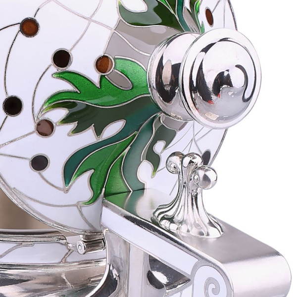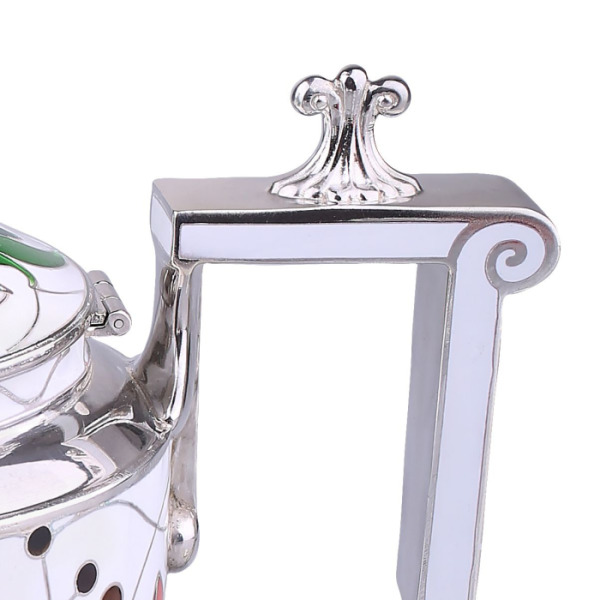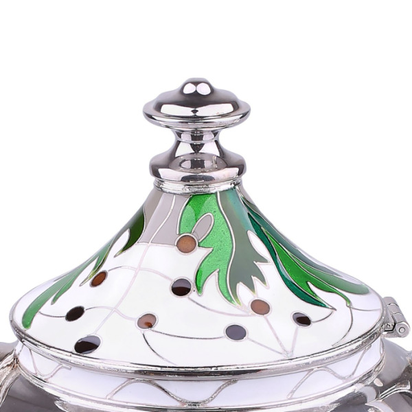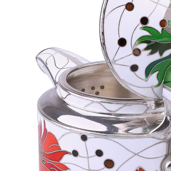 Роспись выполнена вручную в технике перегородчатой эмали — одной из самых сложных и утончённых в ювелирном деле. Тонкая серебряная проволока образует контуры узора, каждая линия припаяна к корпусу, образуя миниатюрные ячейки. Эти ячейки заполняются полупрозрачной эмалью в несколько слоёв и обжигаются при высокой температуре, после чего вся поверхность шлифуется до идеальной гладкости. Эмаль в этой технике словно вбирает в себя свет, а затем мягко отражает его, оживляя весь предмет лёгким мерцанием и глубиной цвета, недостижимой в других видах декора.