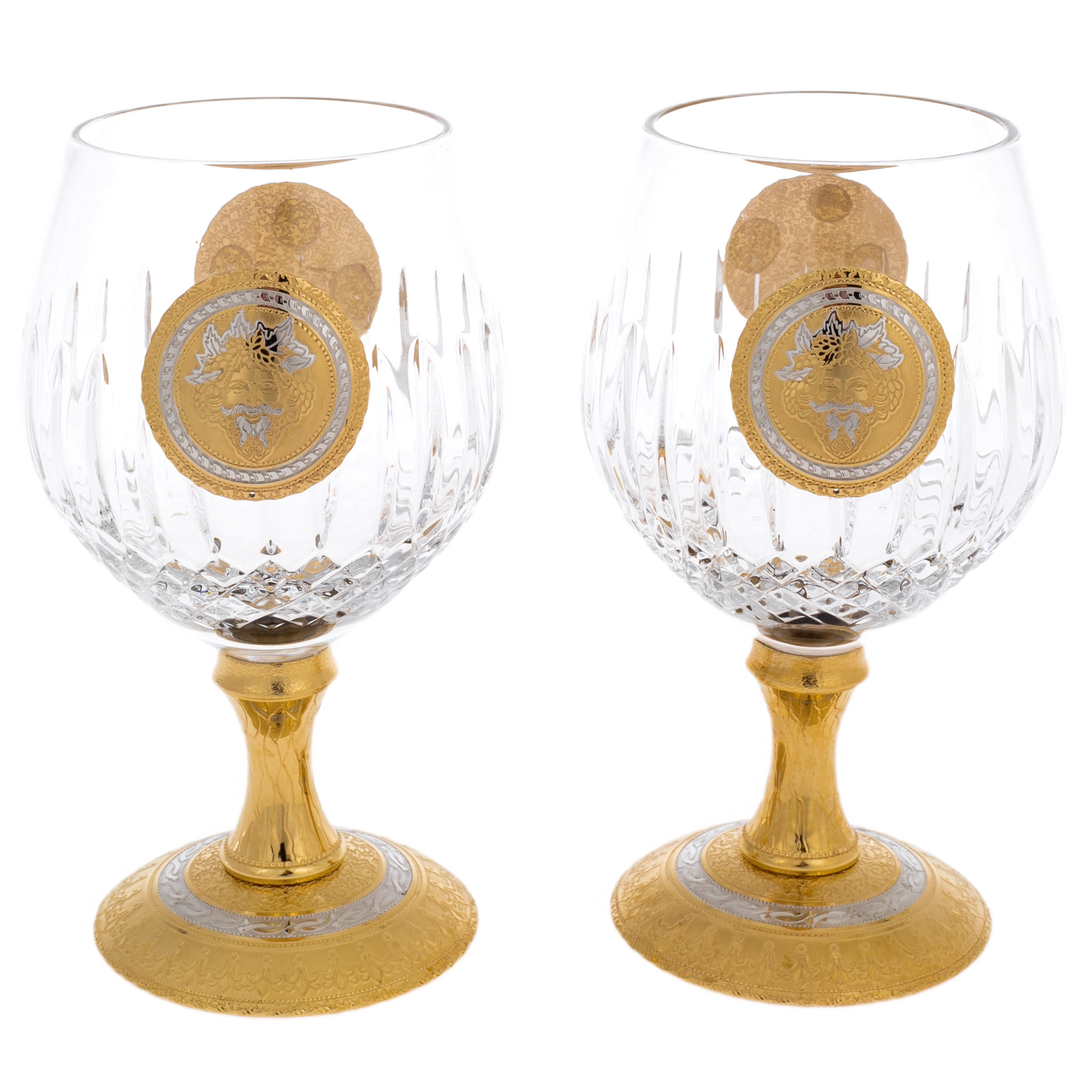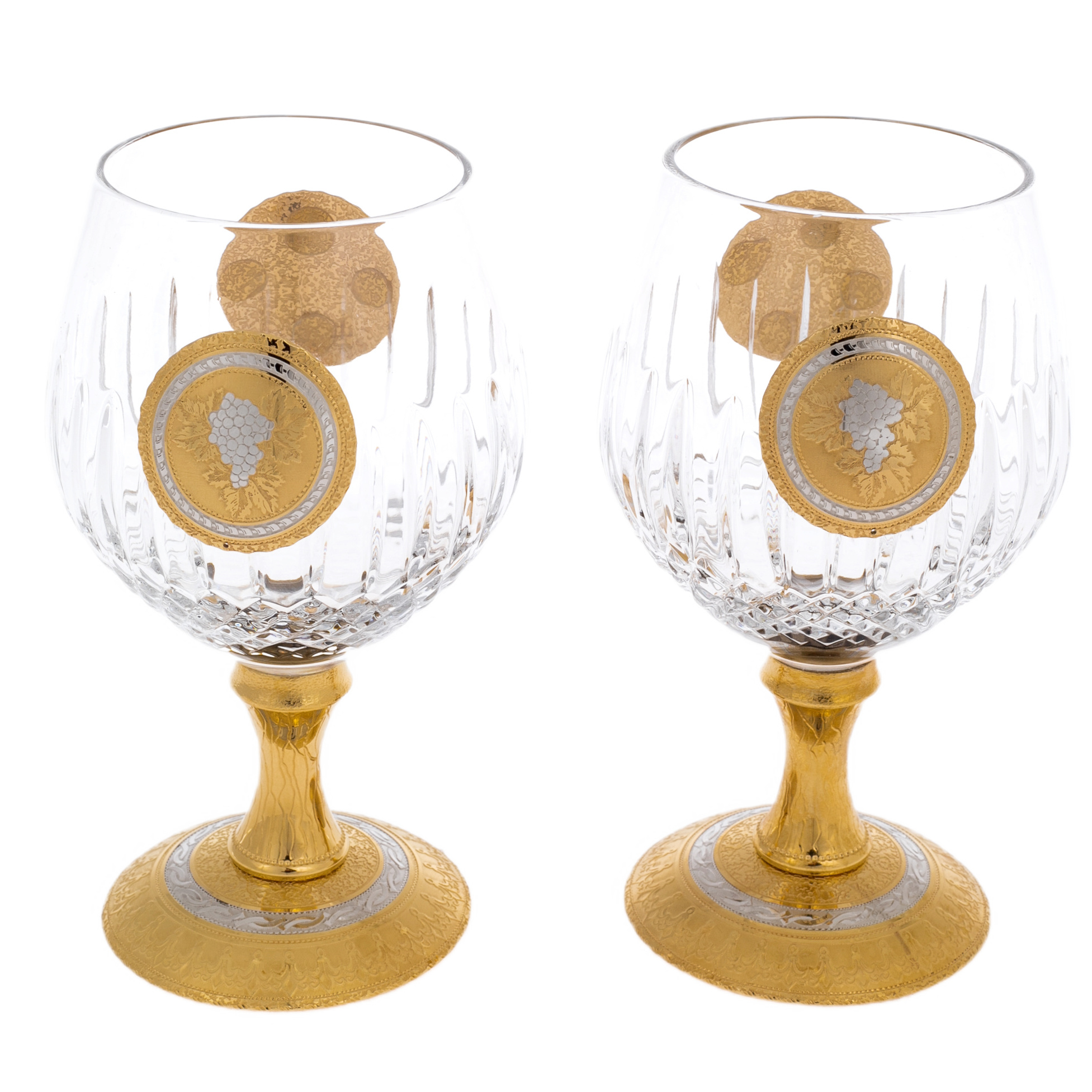 Прозрачные бокалы, словно алмазы, сияют в свете, раскрывая игру граней. Каждый штрих, каждая линия их дизайна продуманы до совершенства. На чашах бокалов — золотые медальоны с изображением виноградной грозди, аллюзия на изобилие, радость жизни и древние традиции виноделия. Этот элемент декора, выполненный с использованием тончайших техник гравировки и позолоты, придаёт бокалам величественность, достойную божественных пиршеств.