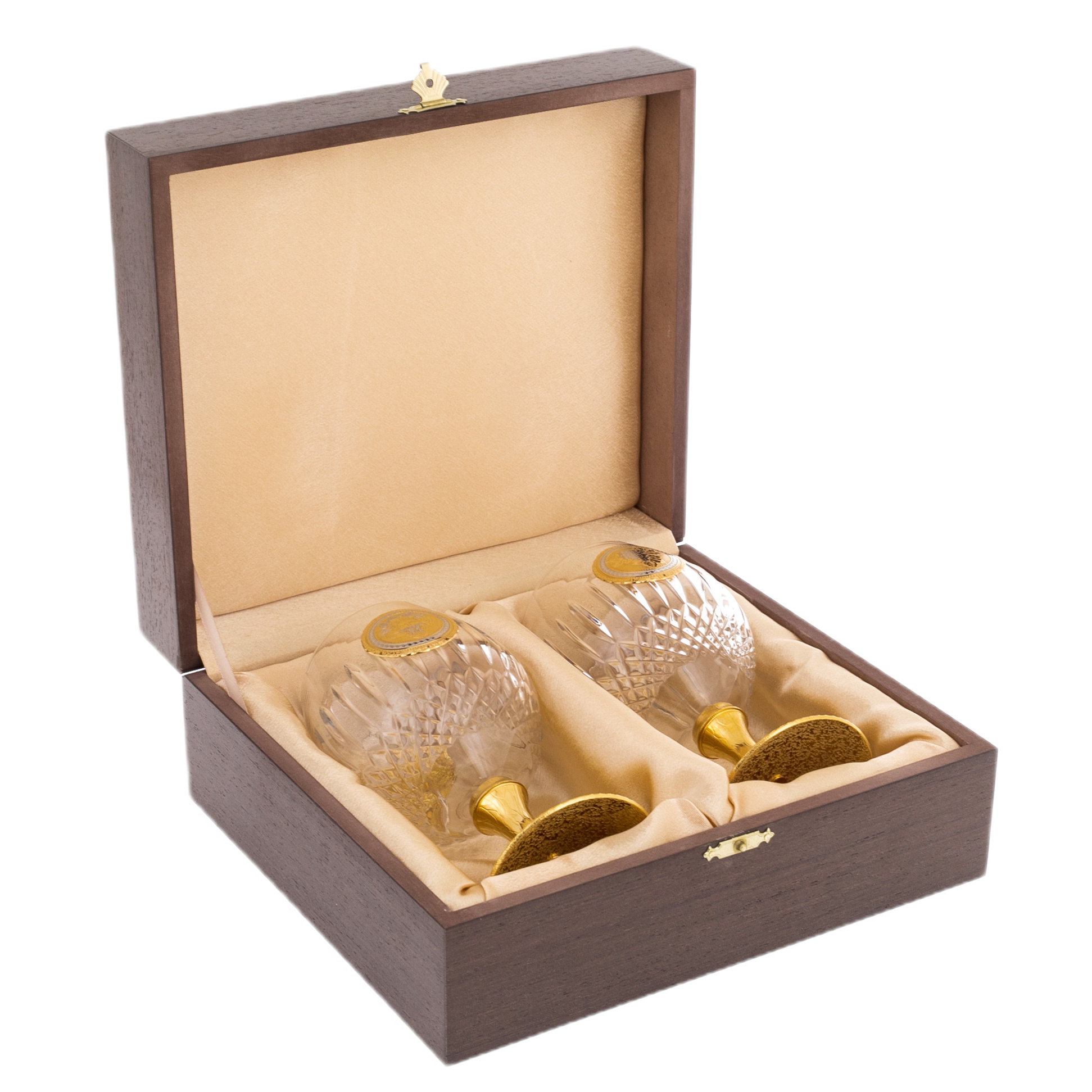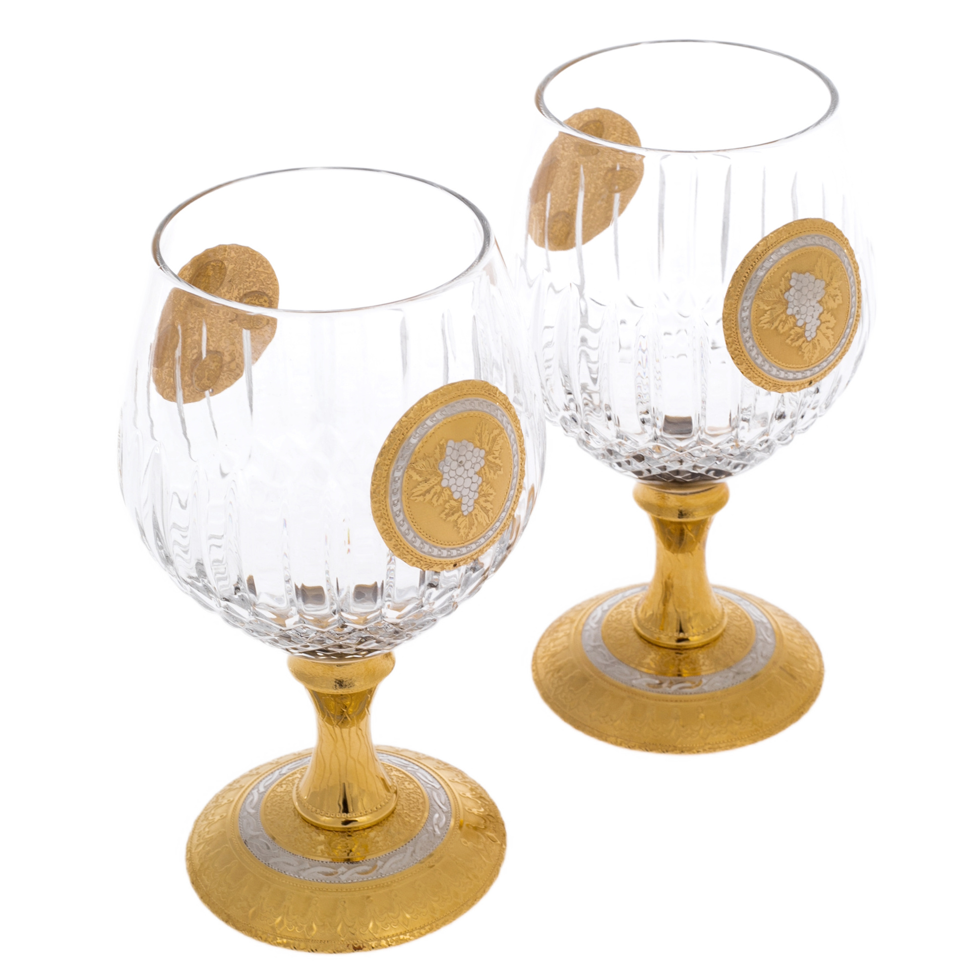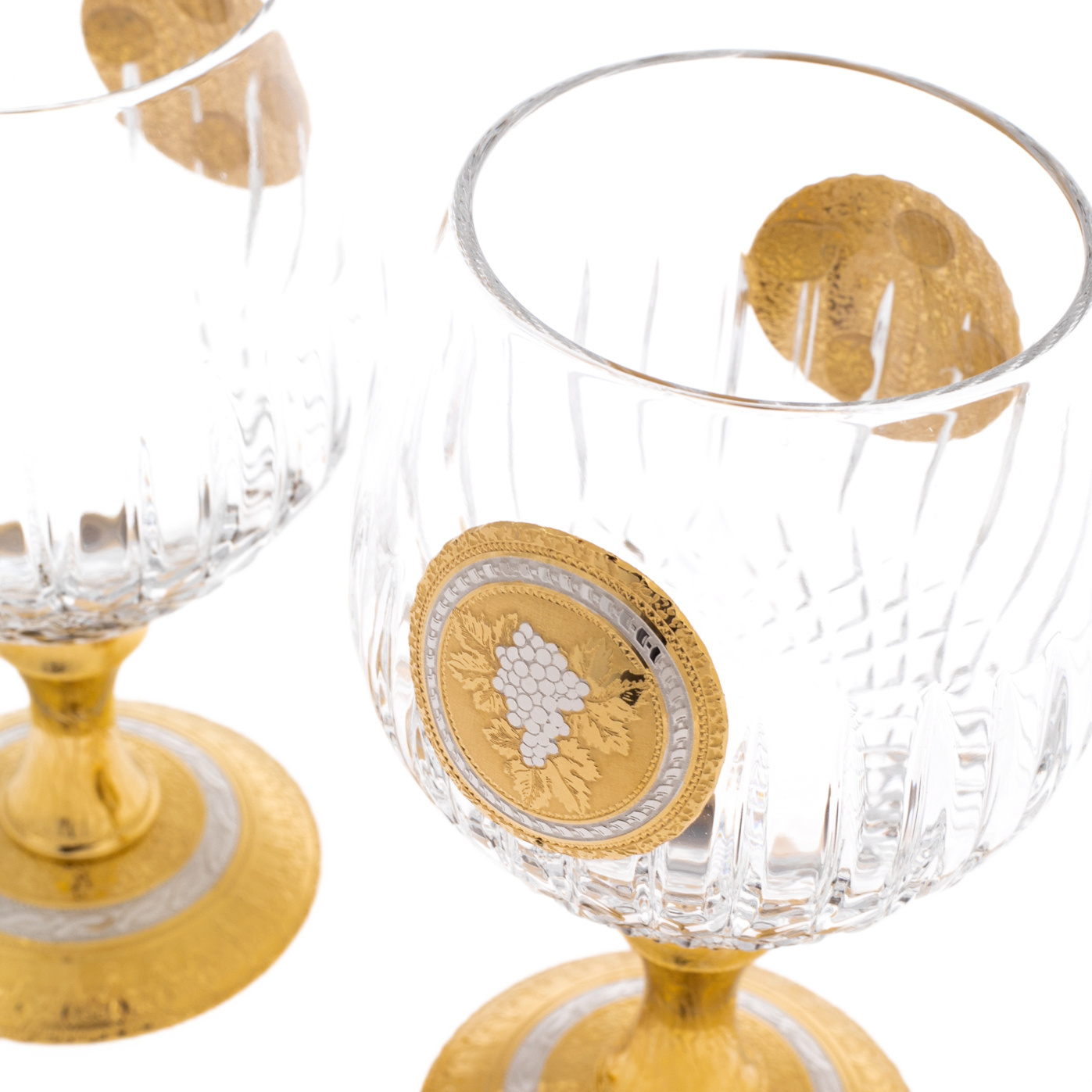 Позолоченные ножки, украшенные утончённым орнаментом, создают баланс между хрупкостью стекла и монументальностью золота. Они не только подчёркивают статус изделия, но и делают его эстетически завершённым. Бокалы удобно ложатся в руку, превращая дегустацию в изысканный ритуал.