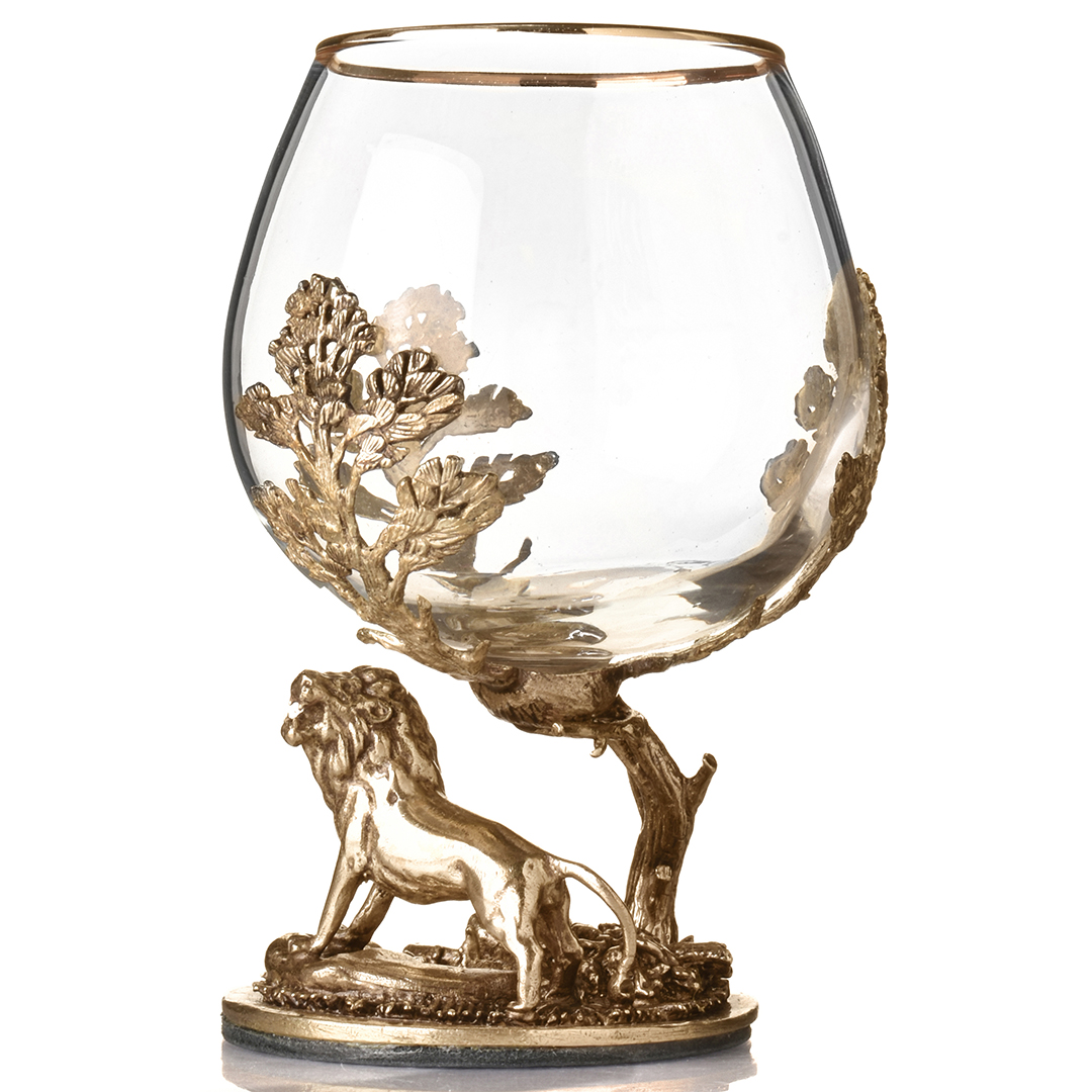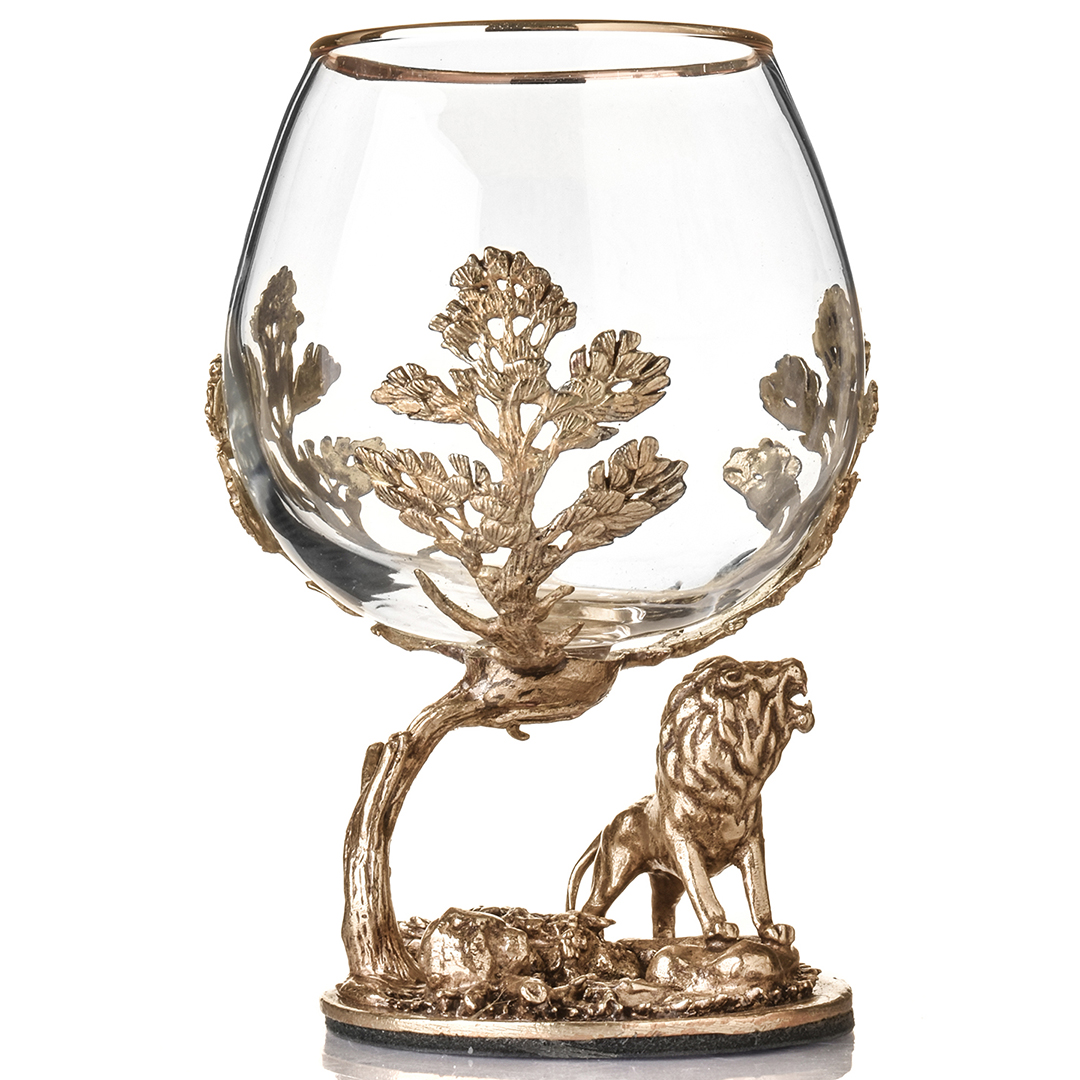 Подарочный набор бокалов и лафитников «Лев» на четыре персоны — это восемь произведений прикладного искусства, созданных для торжественных моментов, где каждый гость — личность, достойная собственной эмблемы. Внутри элегантной коробки, на фоне гладкого атласа, размещены четыре коньячных бокала и четыре лафитника с литым латунным основанием, где каждая композиция воплощает могущество, благородство и внутреннюю свободу. Символ королевской воли — лев, возвышающийся на пьедестале земли под кроной дерева, — отлит с поразительной анатомической точностью и завершает силуэт мощным, уверенным взглядом.