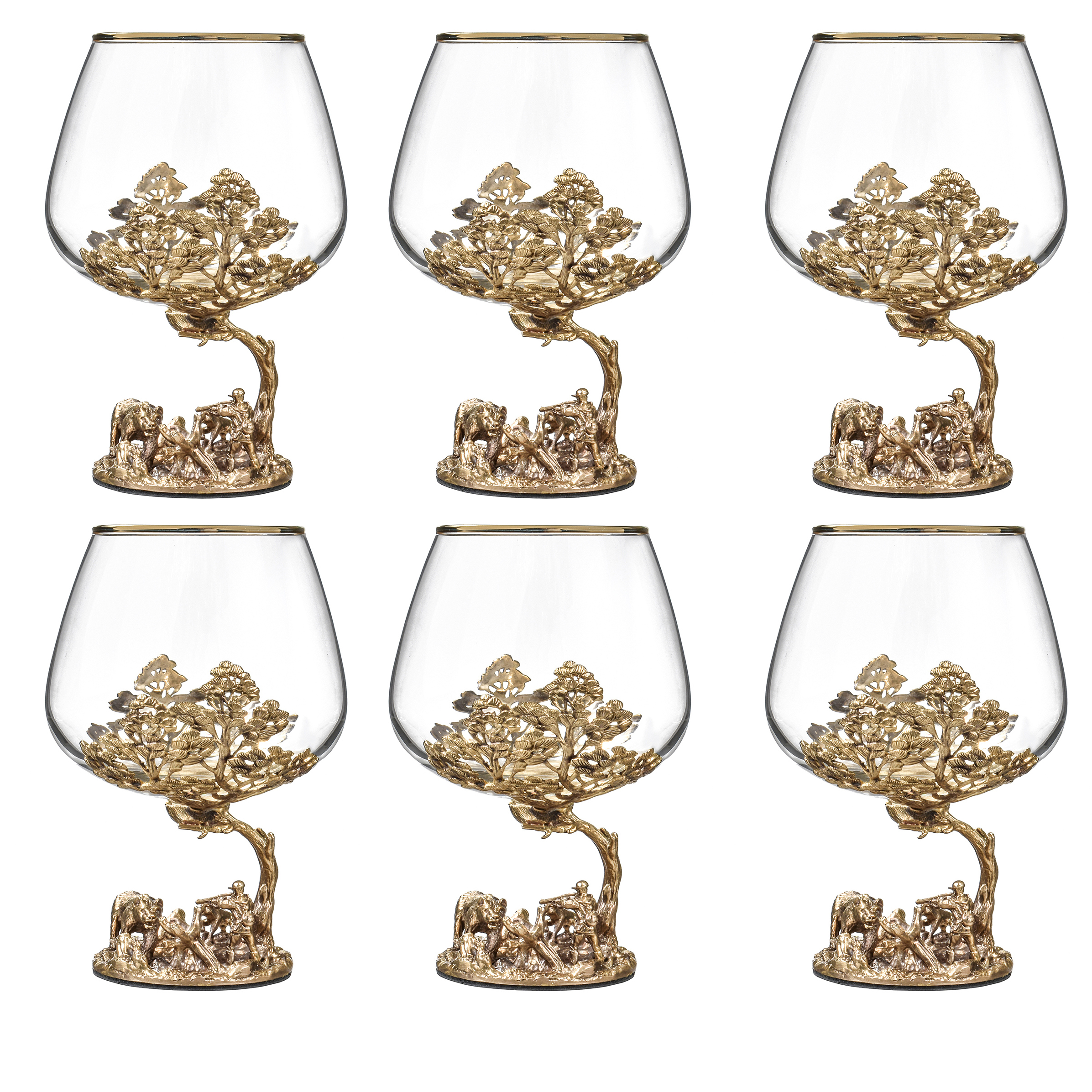 Набор для коньяка "Охота на медведя" на 6 персон — это исключительный аксессуар для истинных ценителей роскоши и утонченности. Включая шесть высококачественных бокалов с уникальными золотыми основаниями, украшенными деталями, символизирующими силу и величие дикой природы, данный набор станет не просто предметом для использования, но и настоящим произведением искусства, которое будет привлекать восхищенные взгляды. Прочные бокалы из кристально прозрачного стекла, дополненные золочеными элементами, позволяют не только оценить изысканность их исполнения, но и прочувствовать символизм, вложенный в их основу.