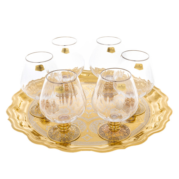 Набор для коньяка "Парящий Орел" на 6 персонНабор для коньяка "Парящий Орел" на 6 персонНабор для коньяка «Парящий орёл» на 6 персон представляет собой образец искусства, рожденного на стыке благородного стекла и ювелирного литья. Шесть бокалов ручной работы обрамлены металлом тёплого золотого тона, словно скульптуры, соединившие природную мощь и тончайшую филигранность. Основание каждого бокала украшено композицией с раскинувшим крылья орлом, поднимающимся с земли, среди гор и листвы, отлитых с удивительной проработкой мельчайших деталей. Металлические элементы создают не просто декоративную основу, но оживляют сюжет: дерево обвивает чашу, словно защищая её от внешнего мира, в то время как птица стремится ввысь.