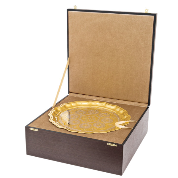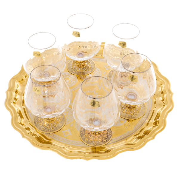 Центральный элемент набора — массивный поднос, сияющий, как солнечный диск. Его поверхность украшена филигранным орнаментом с тонкой серебряной инкрустацией, играющей на контрасте с глубоким золотом. В каждой линии угадывается точность руки мастера, превращающего металл в искусство. Этот поднос не просто основа композиции — он её корона, символ власти, уверенности и стабильности.