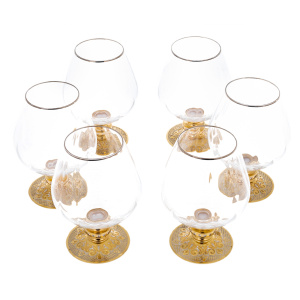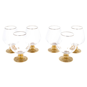 Изящные бокалы на золочёных ножках сияют в свете, словно олицетворяя торжество и благородство момента. Каждая ножка украшена филигранной гравировкой в технике златоустовской инкрустации — с плавными растительными орнаментами, передающими идею движения и роста. Легкое стекло словно создано для того, чтобы раскрыть аромат выдержанного коньяка и подчеркнуть достоинство напитка.