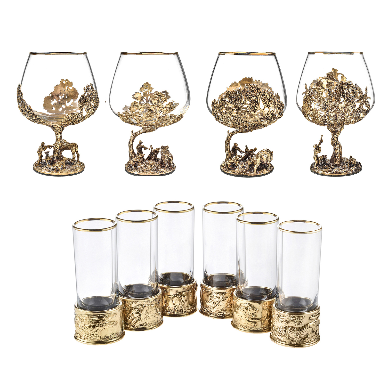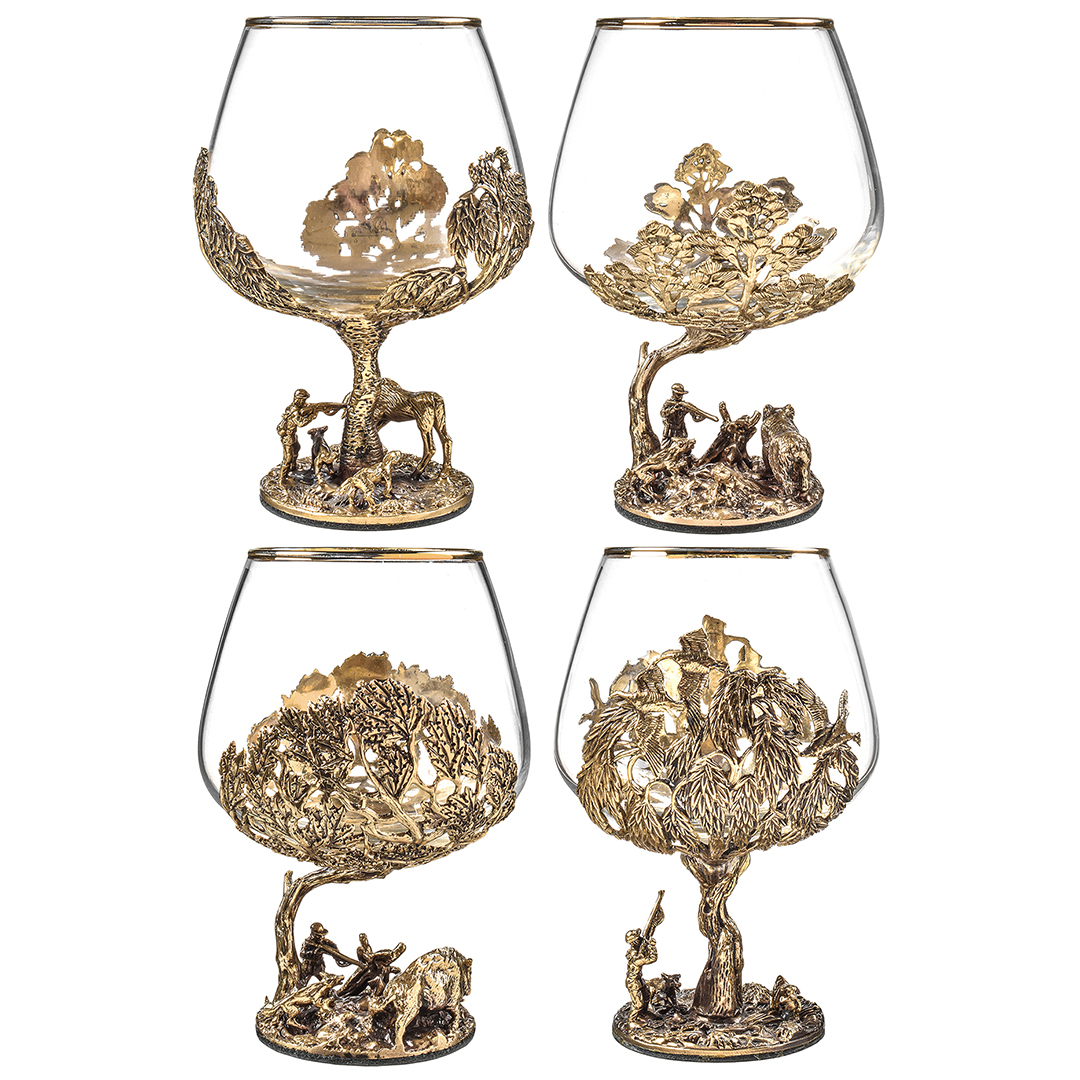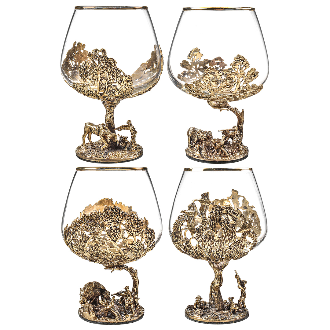 Каждый элемент этого набора выполнен с безупречным вкусом и вниманием к деталям. В наборе представлены бокалы, каждый из которых украшен сценой охоты, выполненной из латуни: охота на оленя, медведя, кабана и уток. Каждая сцена изображена под кронами красивых деревьев, стволы которых служат ножками бокалов. Стеклянные части бокалов обвиты ветвями деревьев, создавая ощущение, будто они растут прямо из природы.