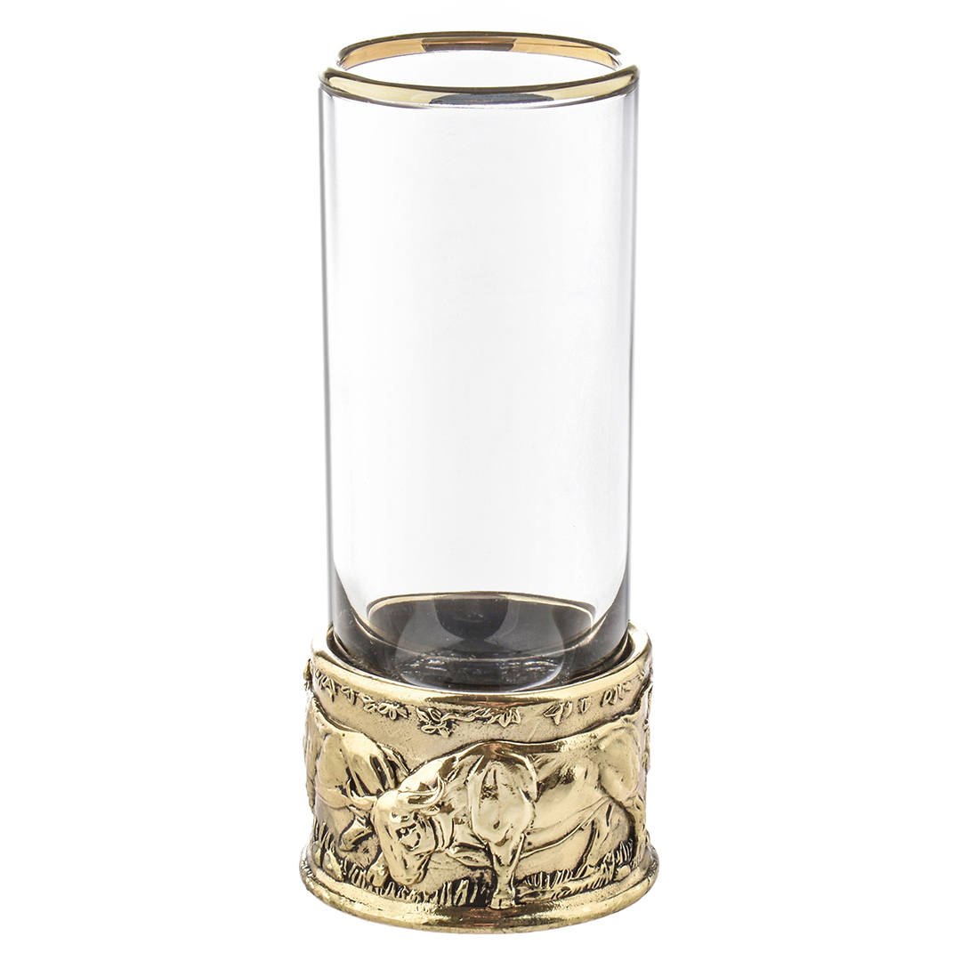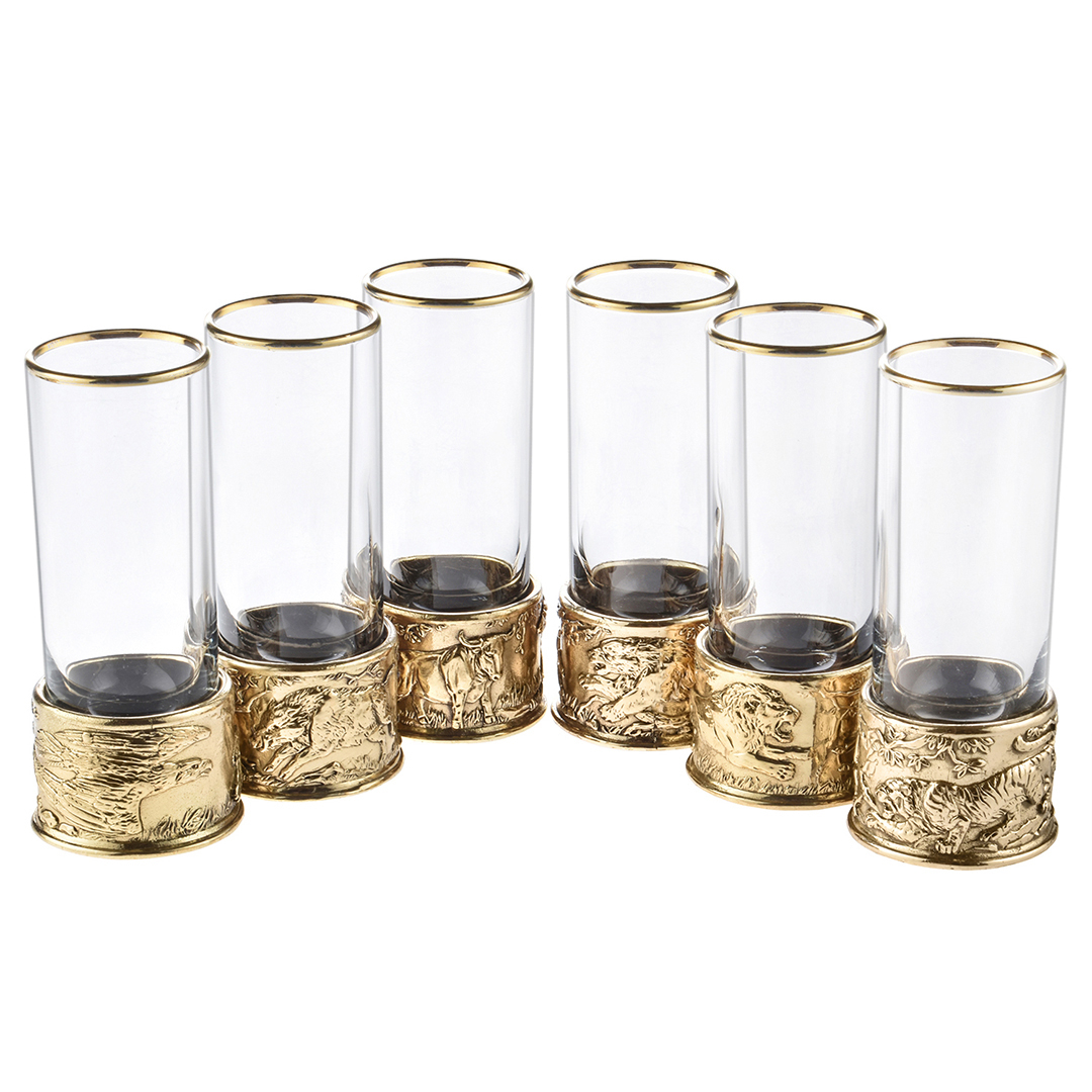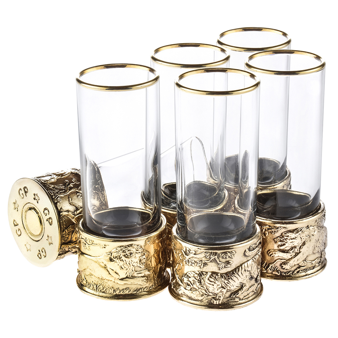 В дополнение к бокалам для коньяка, в набор входят красивые рюмки, выполненные в виде охотничьих патронов. Они также изготовлены с применением художественного литья из латуни, а в их основании изображены различные звери, дополняя общую тематику набора. Каждый элемент набора создан вручную, что делает его уникальным и неповторимым. Художественное литье из латуни с патинированным покрытием придает изделиям античный и благородный вид, подчеркивая высокий статус и изысканность.
