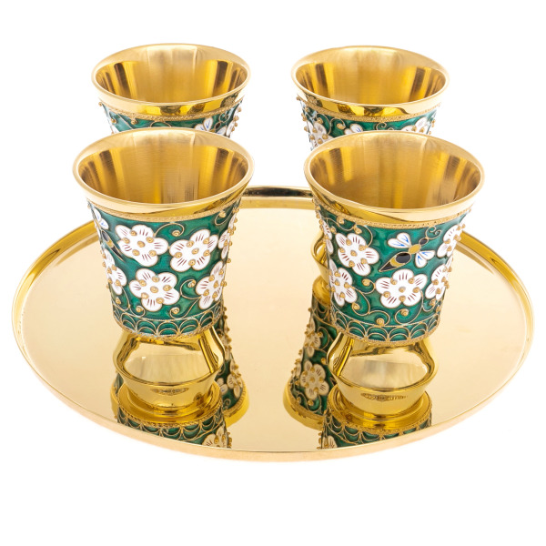 Техника перегородчатой эмали позволяет достичь того же уровня декоративности, что и в лучших образцах древнего искусства. Каждая деталь узора создаётся вручную с применением тончайших проволочных перегородок, внутрь которых поэтапно заливаются эмалевые краски. Повторные обжиги закрепляют рисунок и придают ему характерную глубину и блеск. Контраст между матовой гладью золотистой поверхности и сияющим орнаментом придаёт предметам живой рельеф, создаёт игру света и делает каждый бокал словно ожившим. Это не просто набор — это пример ювелирной культуры, выраженной в прикладном искусстве.
