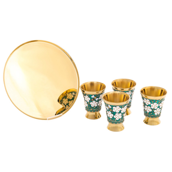 Техника исполнения восходит к древнему искусству перегородчатой эмали, где каждая линия орнамента создана вручную с помощью тончайшей проволоки, формирующей замкнутые контуры под роспись. Узор из снежно-белых цветов на изумрудной листве оживает на фоне синего поля, словно весенний сад под ночным небом. Гладкие глянцевые поверхности чаш и графина подчёркнуты золотыми ободками, создающими игру света и придающими предметам изысканную завершённость. Поднос украшен аналогичным орнаментом, завершая ансамбль и придавая ему статность и симметрию.