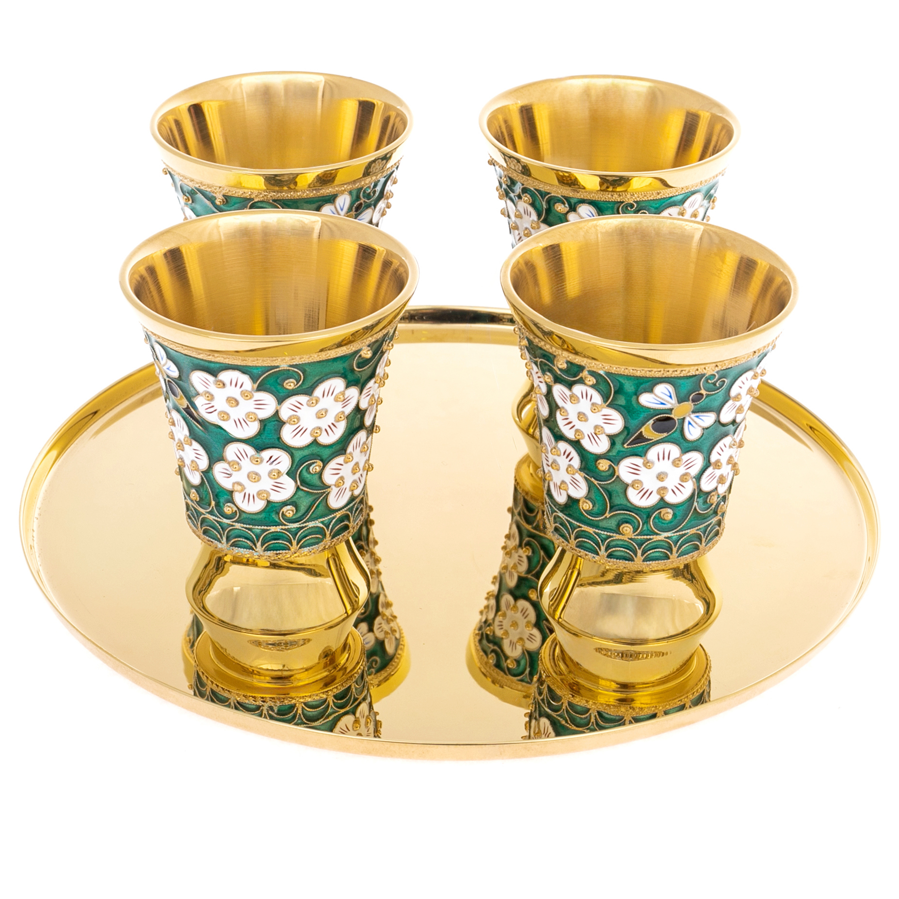 Ликёрный набор на 4 персоны — это не просто сервировочный комплект, а настоящий арт-объект, воплощающий в себе утончённость, богатство декоративной традиции и редкое ювелирное мастерство. Четыре изящных рюмки с плавным расширением кверху выполнены из металла с глянцевой позолотой и установлены на золотистом подносе с зеркальной поверхностью. Глубокий бирюзовый фон в обрамлении белоснежных цветов придаёт набору праздничную лёгкость и декоративную насыщенность, превращая каждую деталь в часть живой композиции.