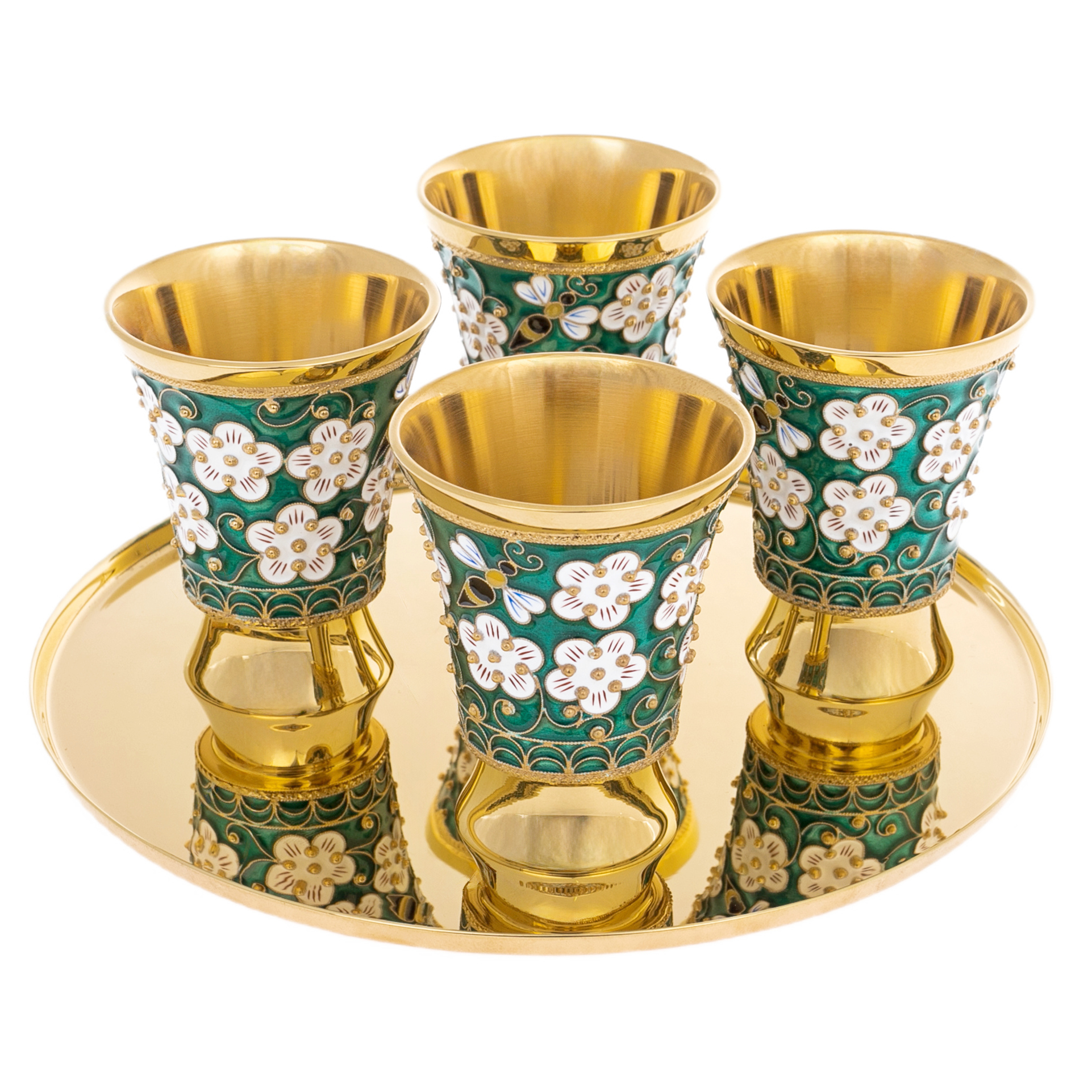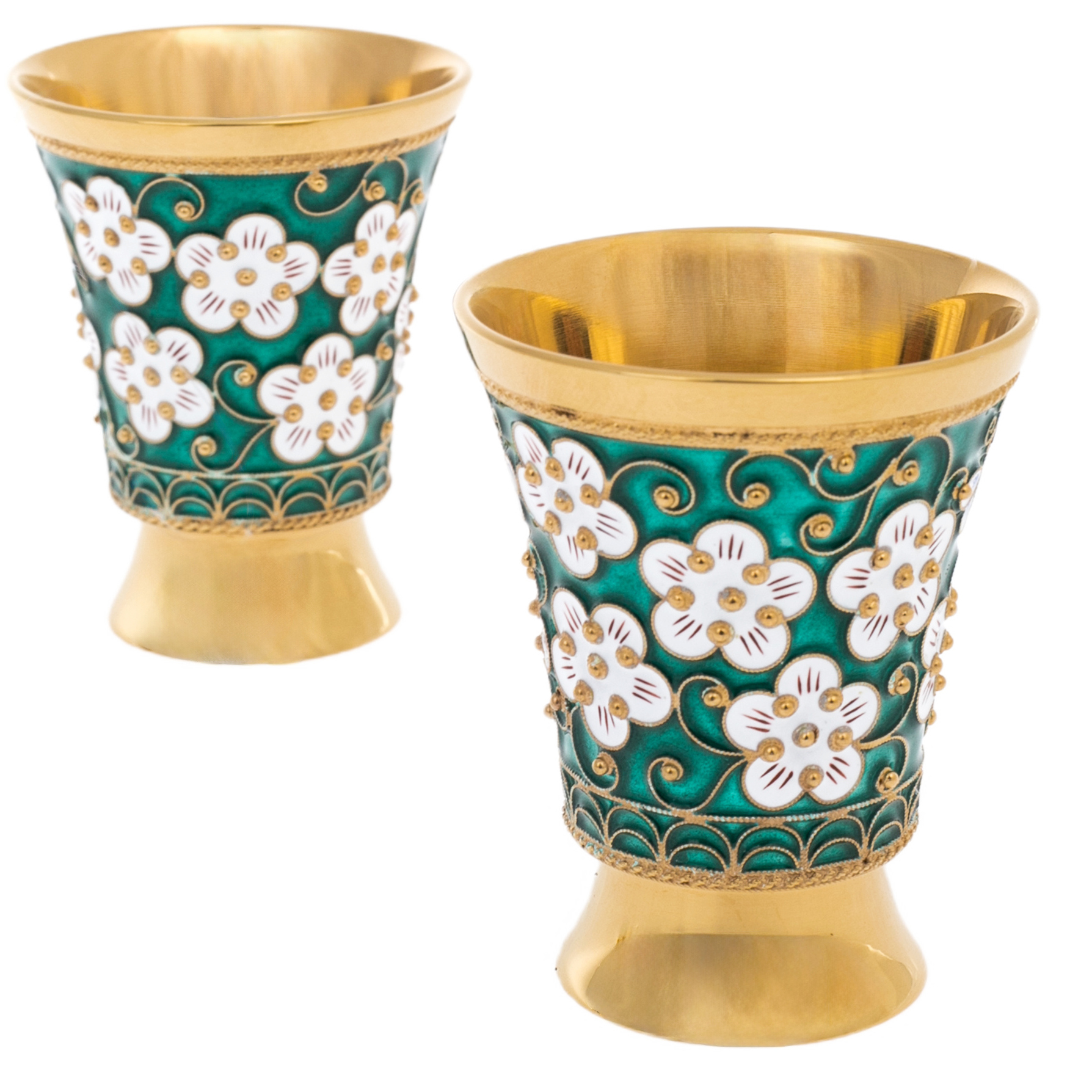 Художественное оформление рюмок выполнено в технике перегородчатой эмали — одной из самых трудоёмких и древних форм декоративно-прикладного искусства. Каждый лепесток, каждая завитушка создаются вручную: на поверхность наносится тонкая проволочная перегородка, заполняемая цветной стеклянной массой, после чего предмет проходит высокотемпературный обжиг. Благодаря этому достигается эффект объёма, насыщенности цвета и прозрачного сияния. В сочетании с позолотой эмаль выглядит особенно роскошно и подчёркивает уникальность каждого элемента.
