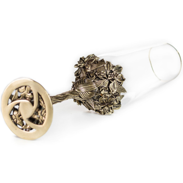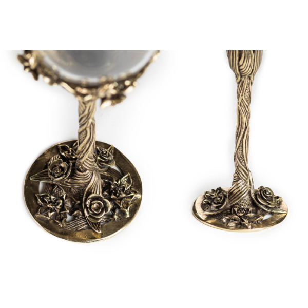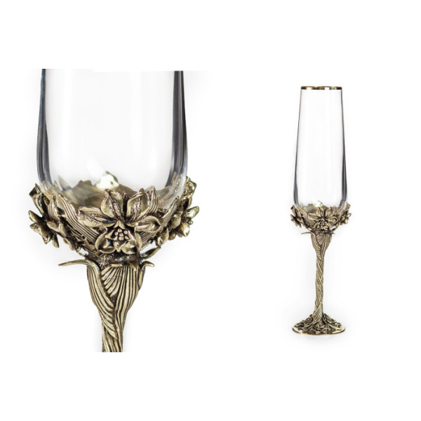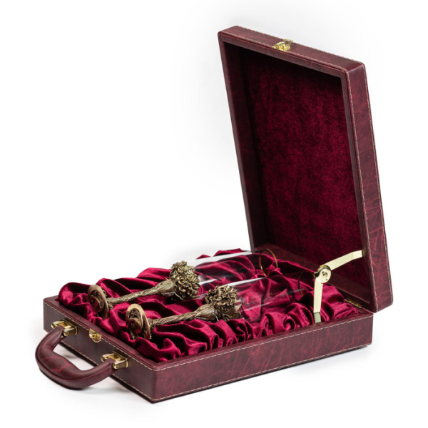 Два прекрасных бокала для шампанского «Нарцисс» в изысканной упаковке тёмно-вишнёвого цвета из искусственной кожи – лучший подарок утончённым натурам. Каждого именинника приведёт в восторг содержимое коробки – на ярком бархатном фоне выделяется стеклянный бокал на латунной ножке ручной работы, украшенной нежными цветами нарцисса.