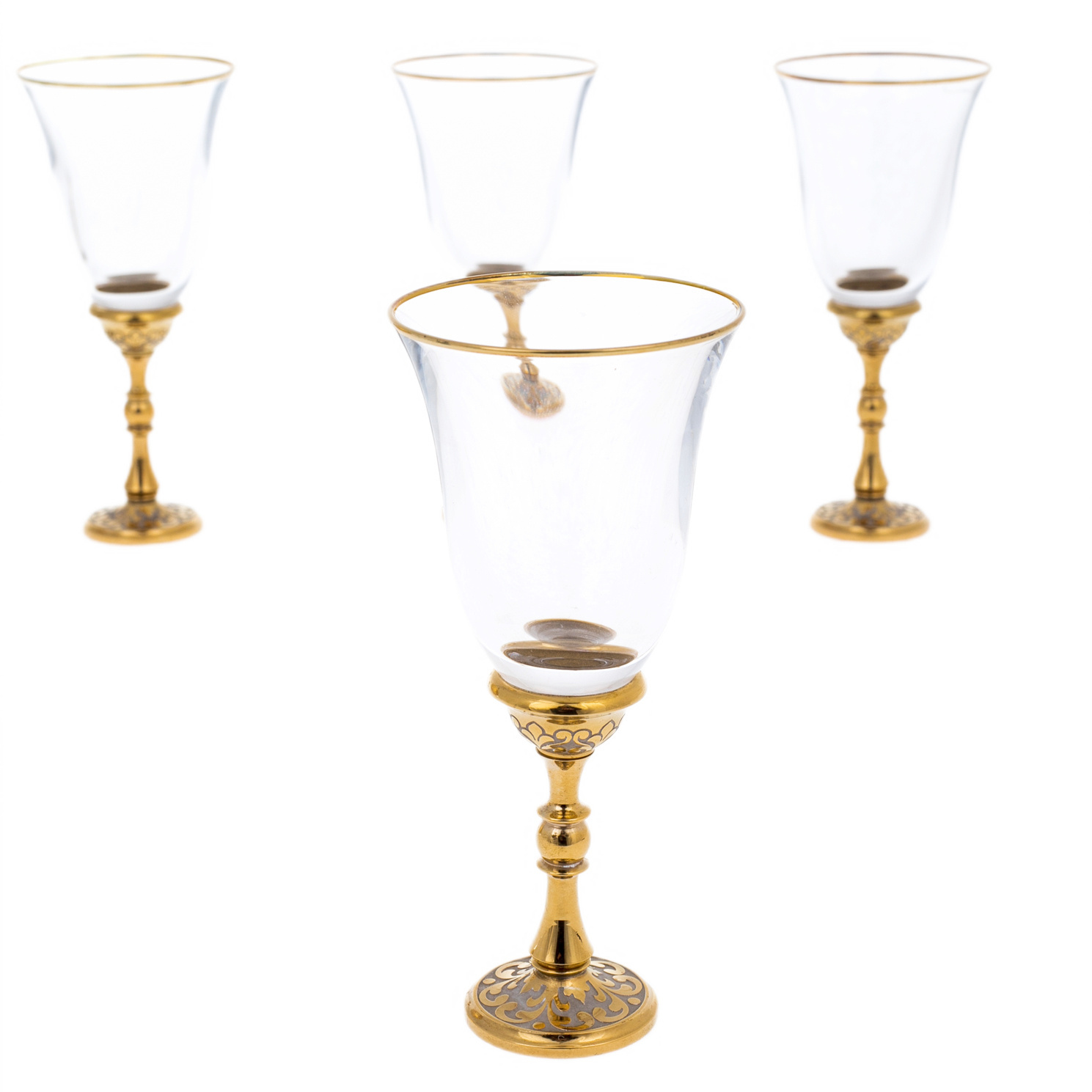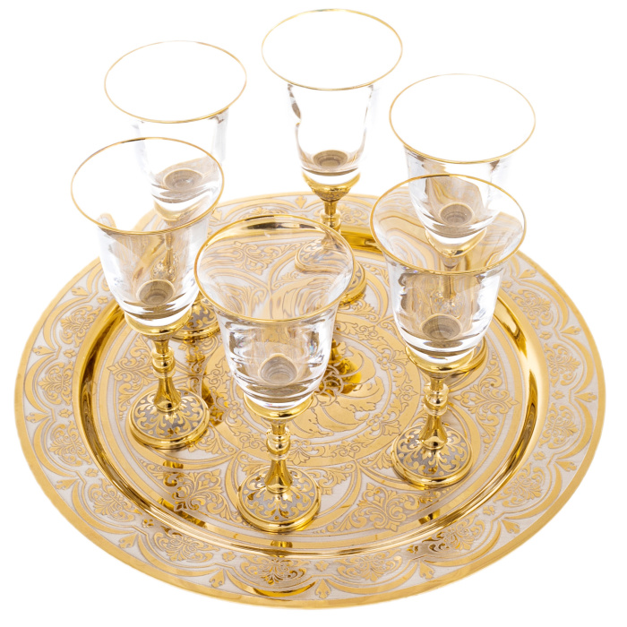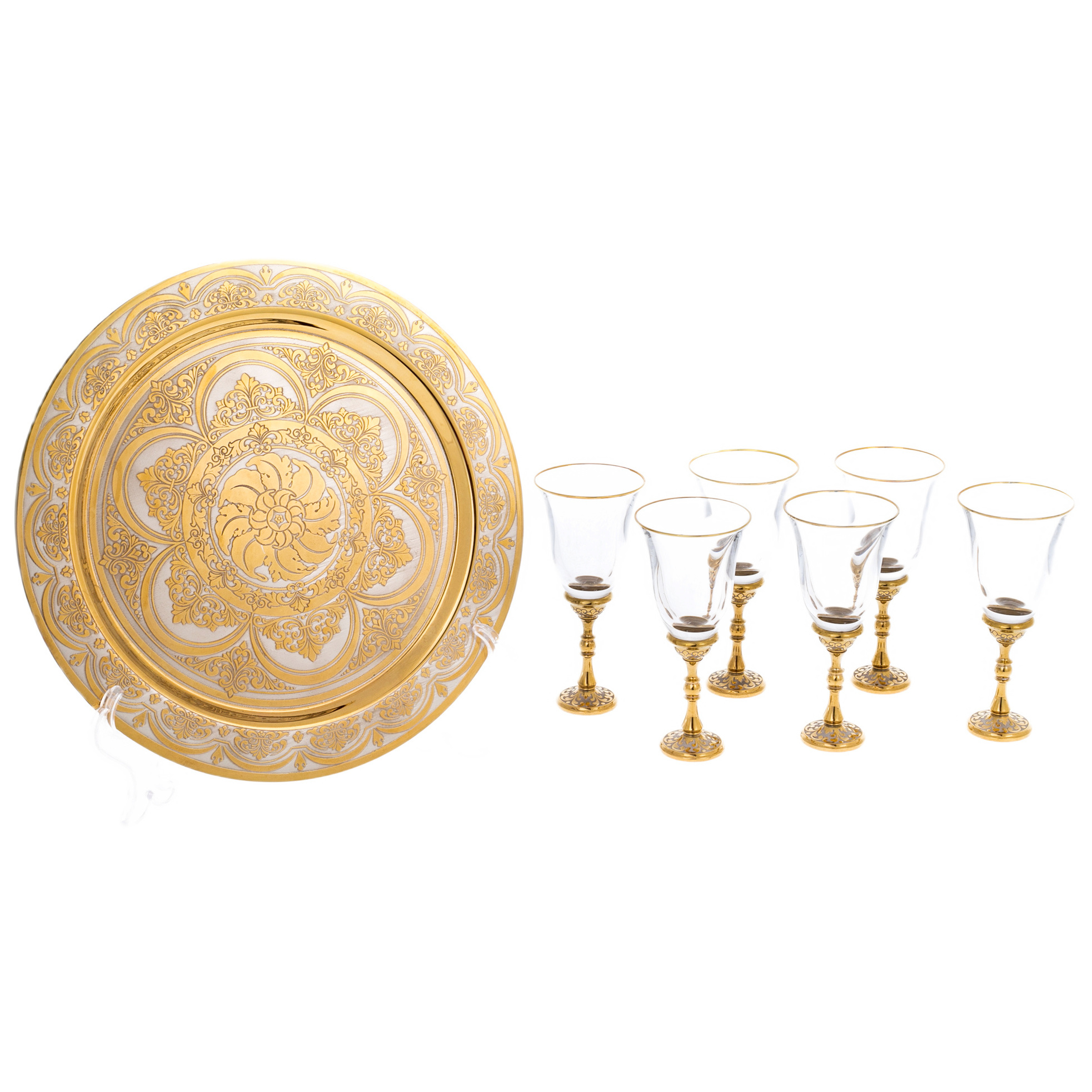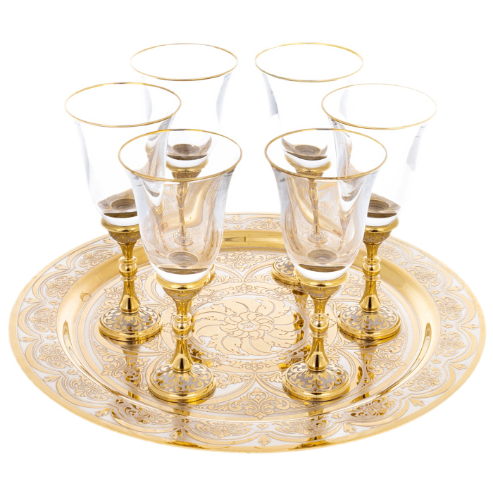 Декор подноса напоминает сложную розетку, раскрывающуюся от центра к краю, словно эмблема торжества, заключенная в круг гармонии. В повторении мотивов на основании фужеров звучит идея согласованности: шесть бокалов воспринимаются не отдельными предметами, а ансамблем, задающим ритм празднику. Прозрачность стекла подчеркивает игру золота, а тонкая линия по краю чаши добавляет сервировке ювелирную завершенность. "Изыск" создан для тех, кому близка культура безупречных деталей, когда одно движение — поднятый фужер — говорит о вкусе громче любых слов.