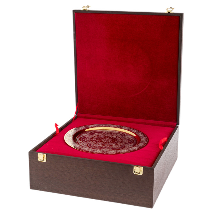 В основе художественного характера — златоустовская школа декоративной гравировки, узнаваемая по филигранной проработке фона и точности линий. Орнамент наносится вручную, выстраиваясь из завитков и симметричных мотивов, после чего металл полируется, раскрывая глубину рисунка и контраст между светом и тенью. Золочение придает поверхности теплое, "живое" сияние, не дробя узор, а собирая его в единую композицию. Даже в мелких элементах — на ножках, основаниях, поясках — чувствуется ремесленная дисциплина, ценимая в предметах, рассчитанных на десятилетия.