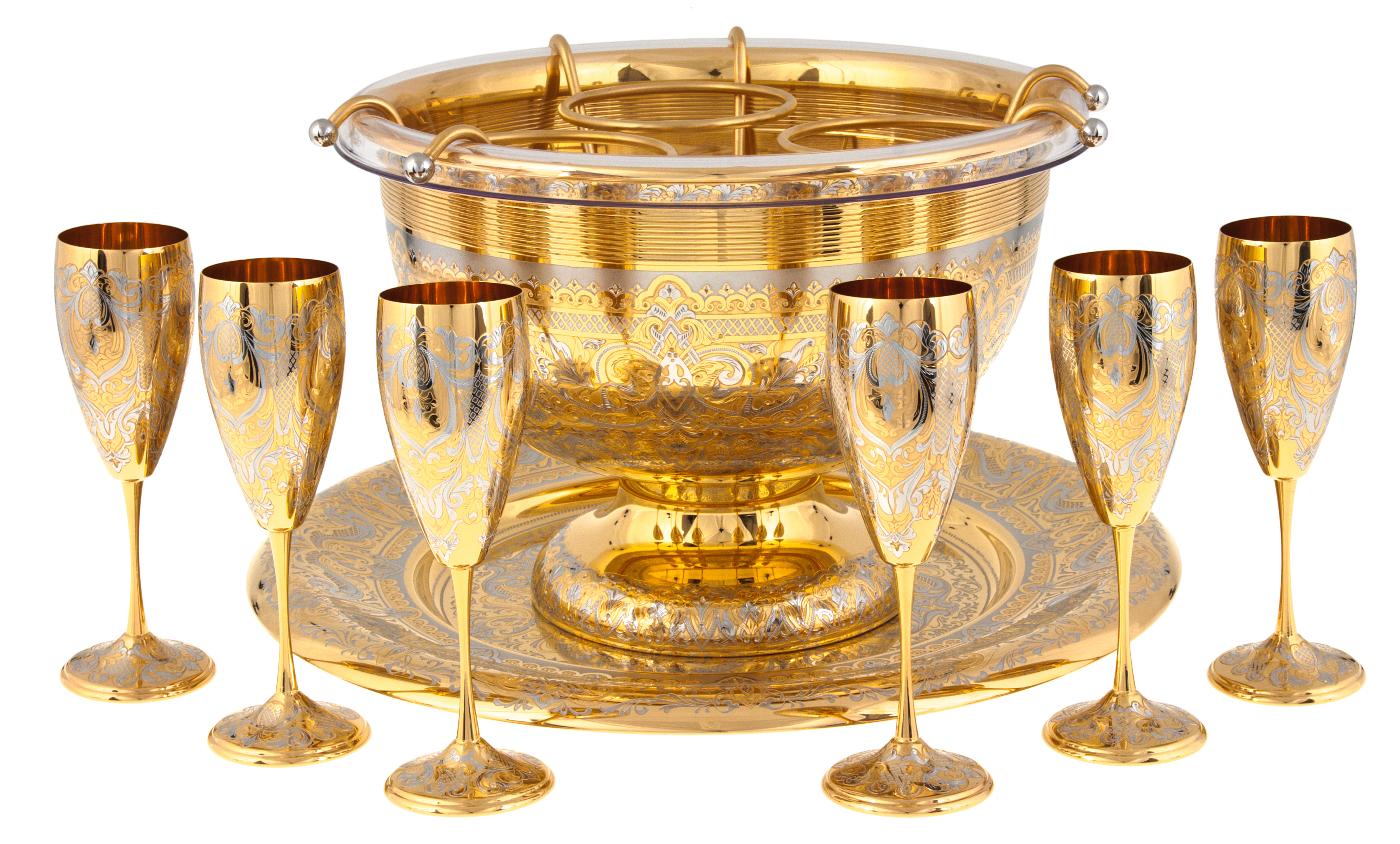 Кубок для шампанского, венчающий композицию, — символ изящества и лёгкости. Его изогнутые линии и утончённая ножка, украшенная ювелирной гравировкой, рождают ассоциации с торжественными ритуалами и благородными традициями. Внутреннее золочение добавляет глубины, позволяя шампанскому искриться, словно жидкий свет, отражающий блеск жизни и её бесконечные возможности.