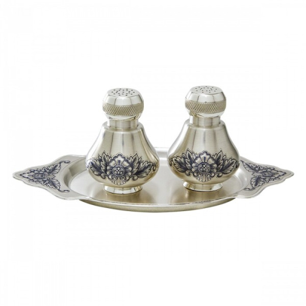 Набор для специй "Черневой" из серебра 925 пробы изготовлен мастерами великоустюгского завода «Северная чернь». Сплавы, содержащиеся в пробе, придают изделию прочность и защиту от механических повреждений.