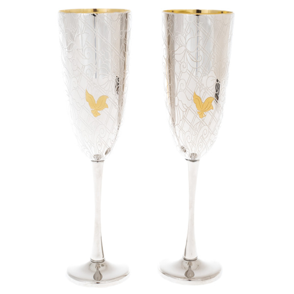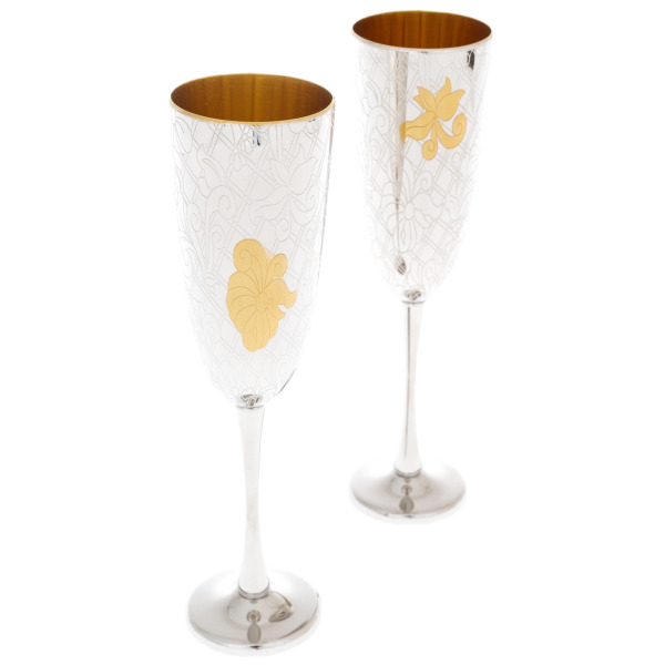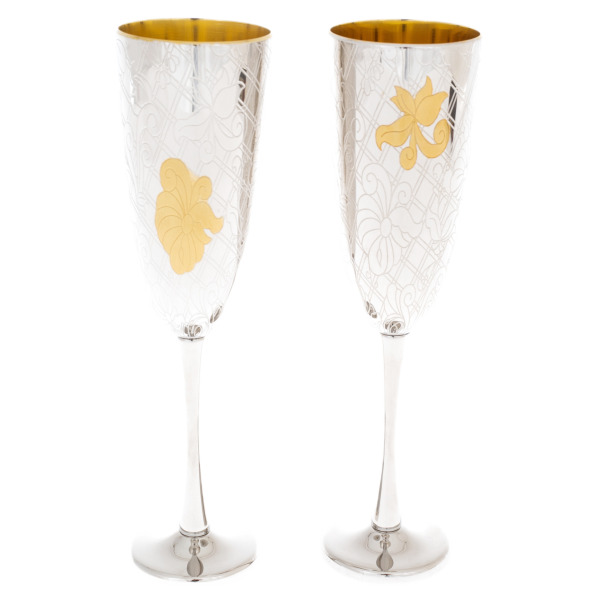 Бокалы искусно украшены гравировкой и изящными флорентийскими узорами, что придает им не только визуальную красоту, но и глубокий символизм. Вино, налитое в них, приобретает особенный вкус, словно бы оно становится частью вековых традиций и таинства наслаждения. Внутреннее золочение усиливает блеск вина, наполняя его отблесками роскоши и величия.