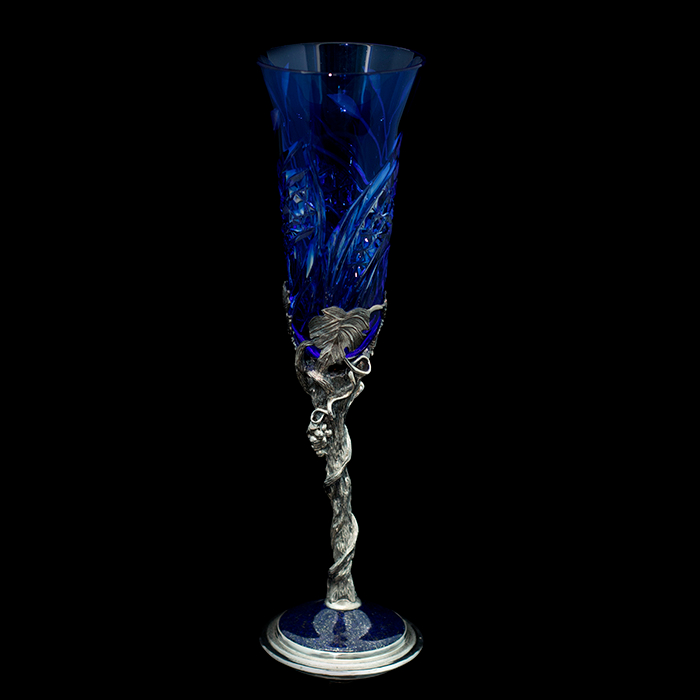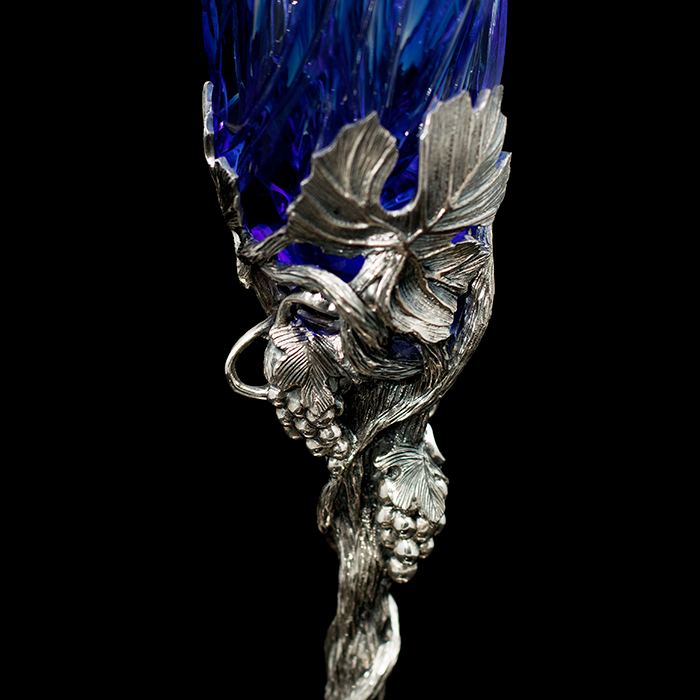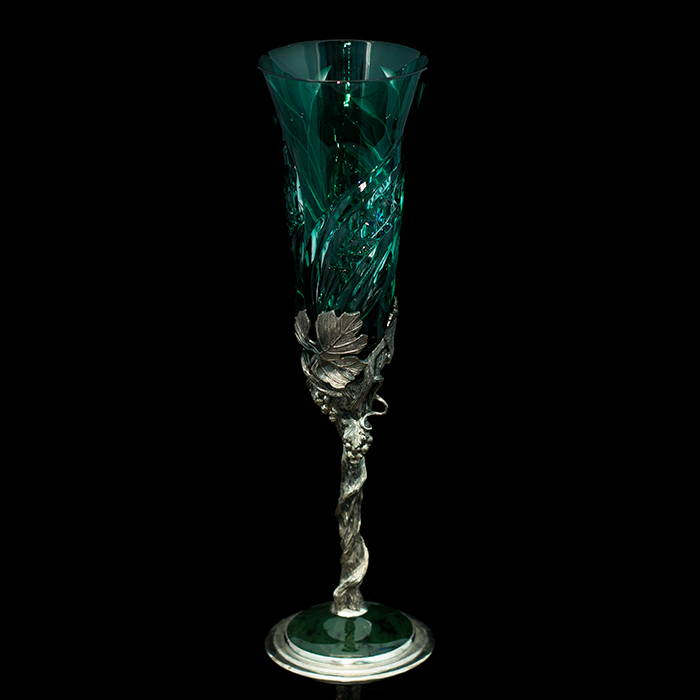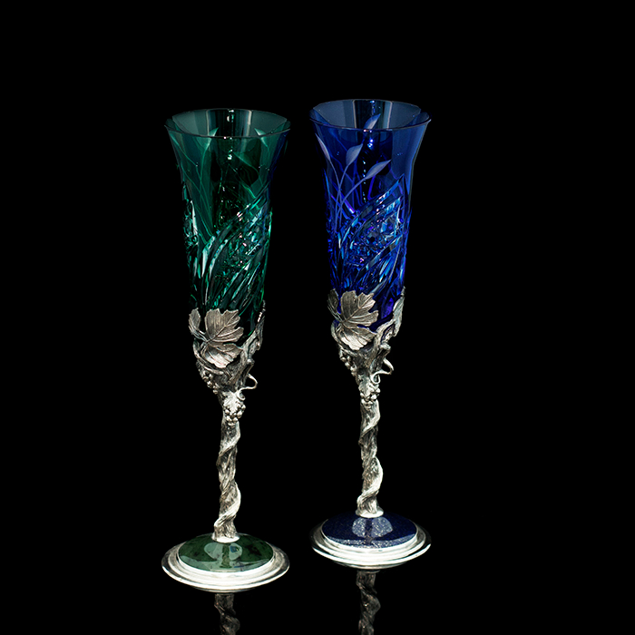 Уникальные бокалы "Весна" выполнены из серебра 925 пробы в сочетании с элитным хрусталем Villeroy & Boch, а также вставками из камней нефрит и афганский лазурит.