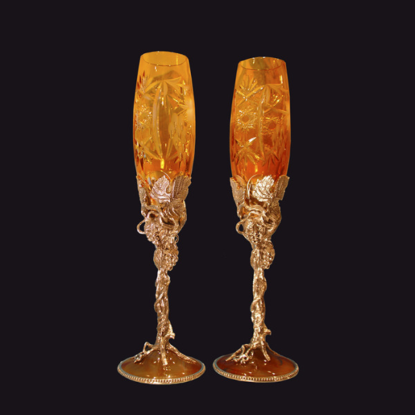 Изящные бокалы "Виноградная лоза" янтарного цвета выполнены из серебра 925 пробы в сочетании с позолотой, богемским хрусталем и камнем янтарь.