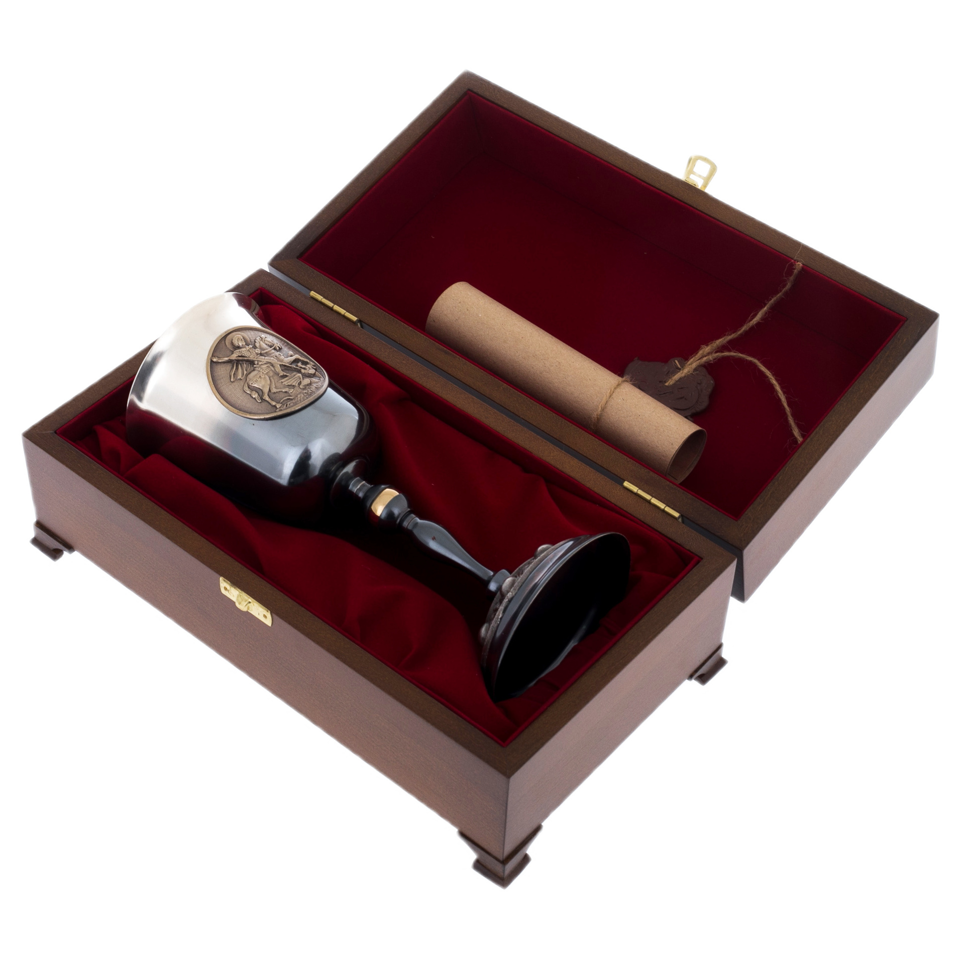Вашему вниманию мы представляем эксклюзивный подарочный набор "Георгий Победоносец" с целью удовлетворения самых изысканных потребностей. Этот набор – это гармоничное сочетание высококачественных пород дерева – как признак особого статуса изделия, благородных металлов, обработанных вручную и изящно уложенных в один из самых приятных на ощупь материалов – бархат. А самое главное, что обладатель набора не только украсит интерьер своего кабинета или дома, но и сможет использовать его по прямому назначению, например, угостив своих гостей вином из бокала