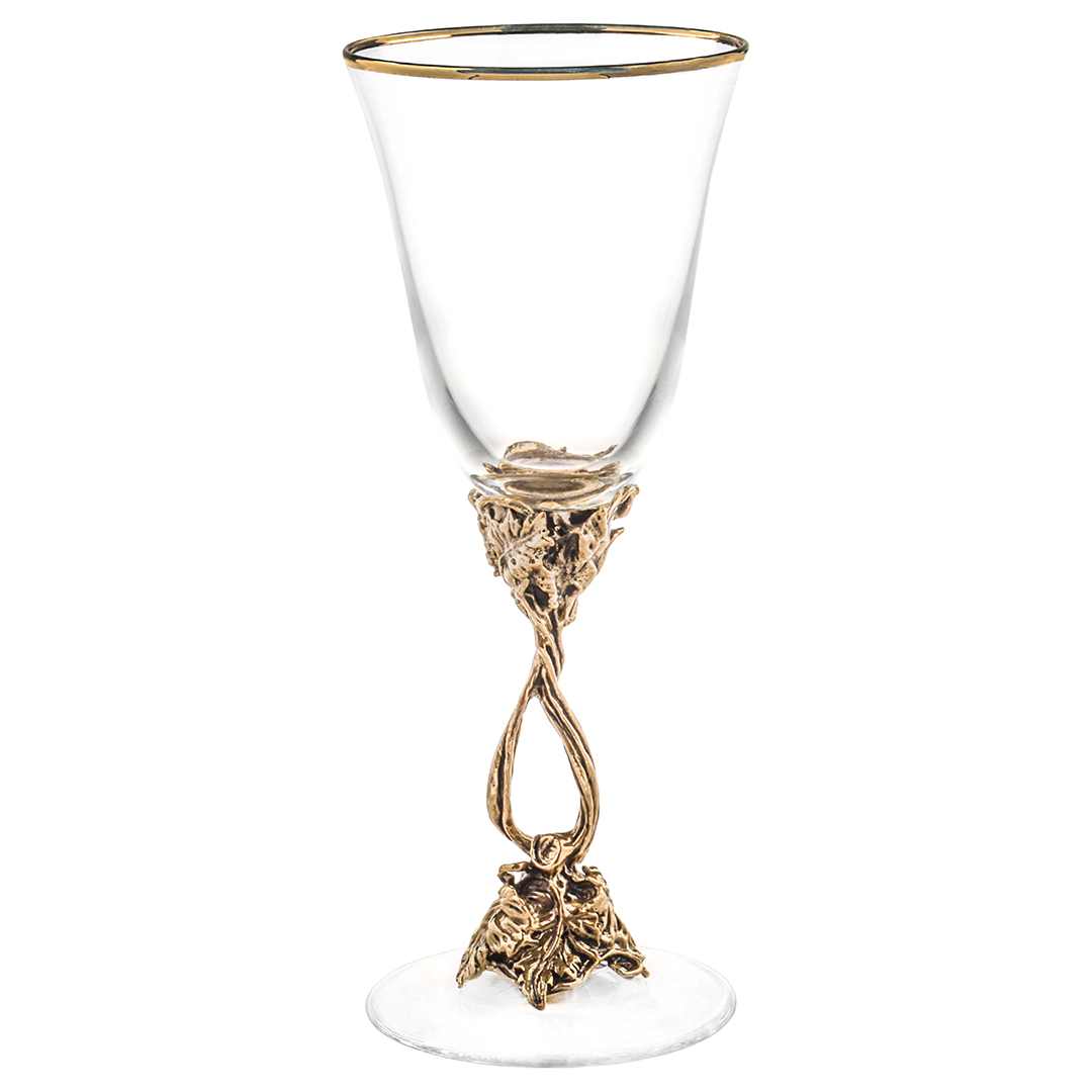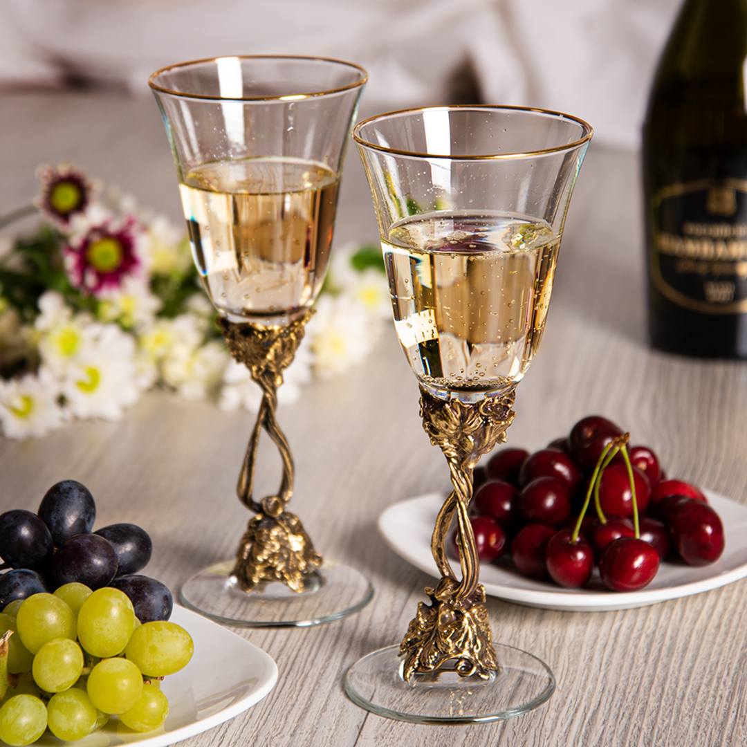 Винный набор «Романтик» на две персоны — утончённая пара бокалов, созданная для камерных вечеров, где важны не только вкус, но и эстетика момента. Прозрачные чаши венчает тонкая золотистая кайма, отражающая свет с изысканной деликатностью. Ножки, выполненные из патинированной латуни, воспроизводят изящный изгиб виноградной лозы, замершей в скульптурном движении. Основание каждого бокала оформлено рельефными листьями, словно срезанными с лозы в пик зрелости — с чётко очерченными прожилками и естественной фактурой.