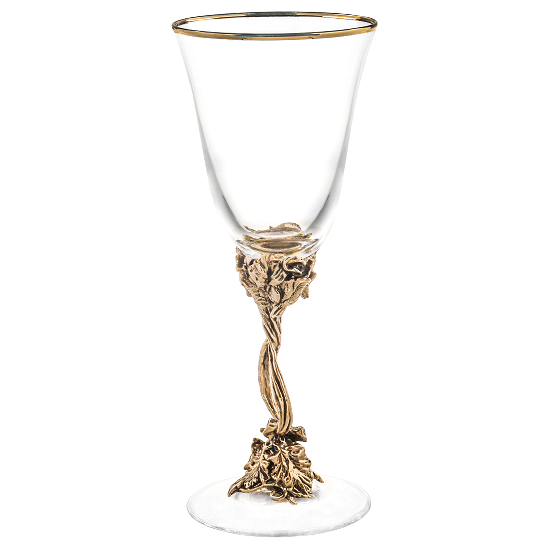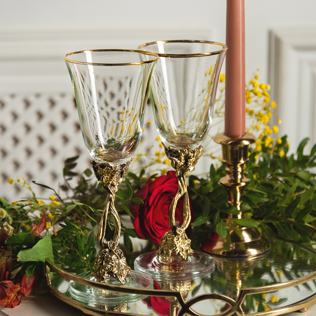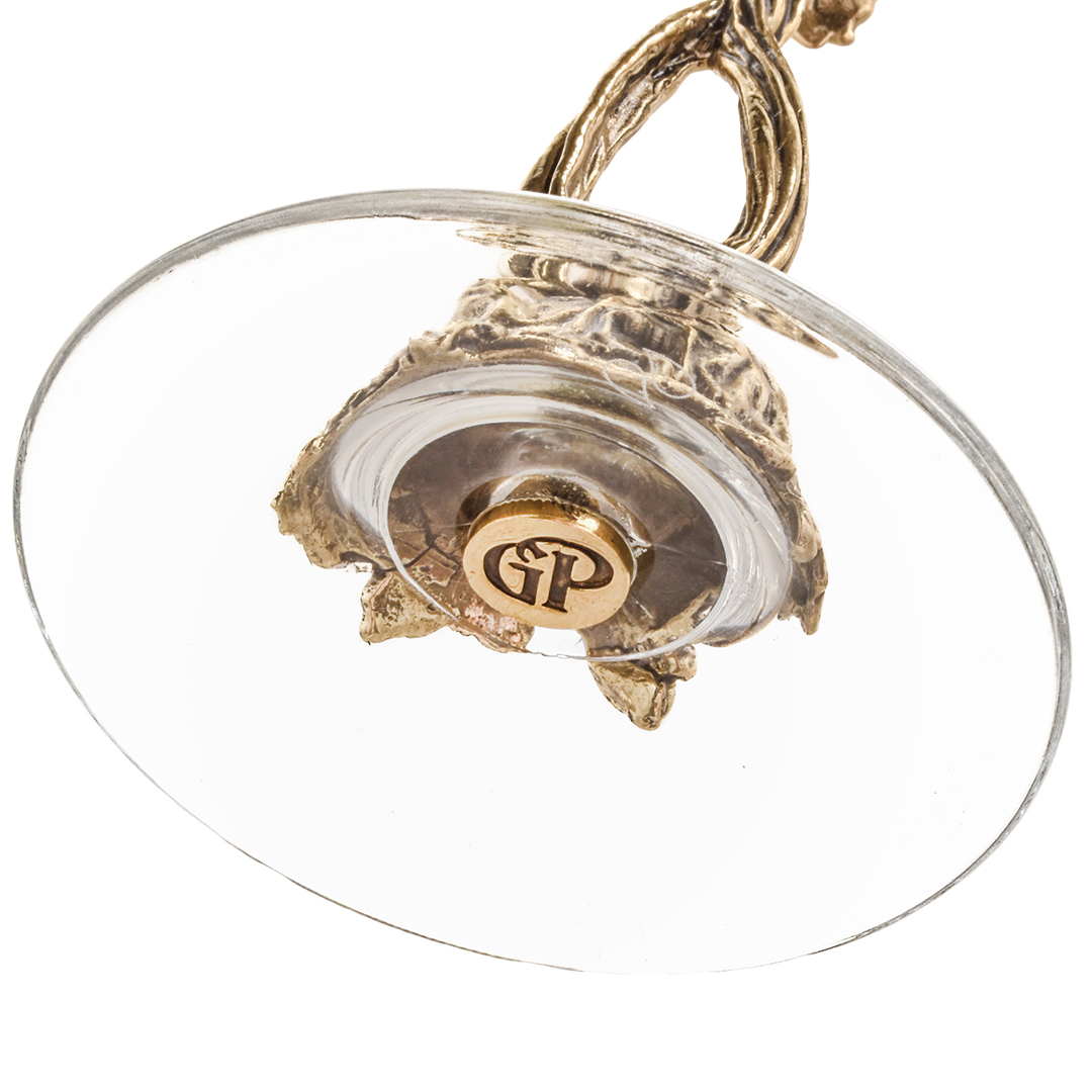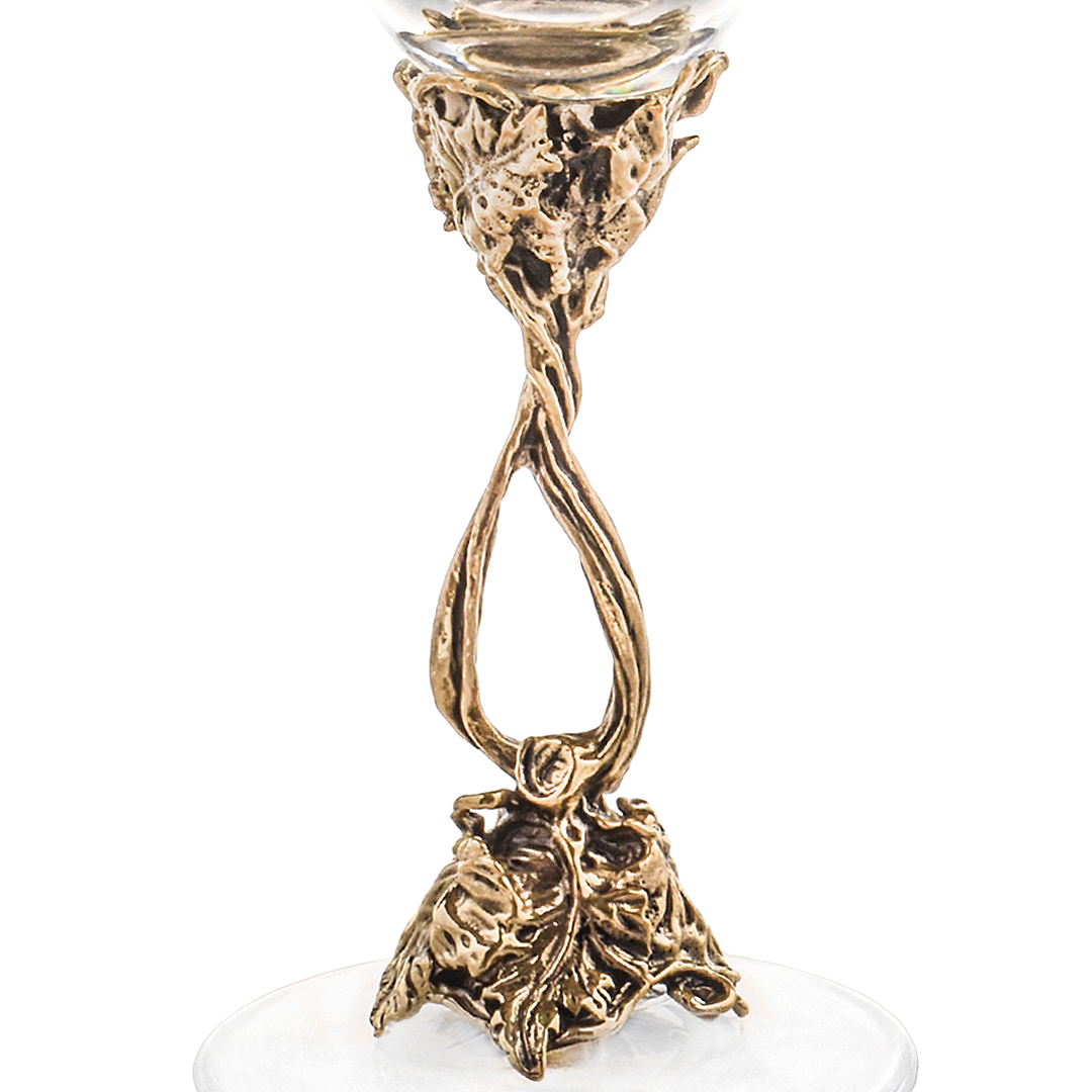 Металлические элементы отлиты с точностью, достойной ювелирного искусства. Латунь, вручную патинированная до насыщенного, глубоко золотистого оттенка, подчёркивает природную тему дизайна, связывая земное с возвышенным. Ножка не просто соединяет чашу и основание — она служит художественной осью композиции, превращая функциональный предмет в декоративный объект. Линии плавные, выразительные, словно застигнуты в момент органического роста. Каждый бокал балансирует между лёгкостью стекла и весом формы, создавая впечатление завершённого произведения.