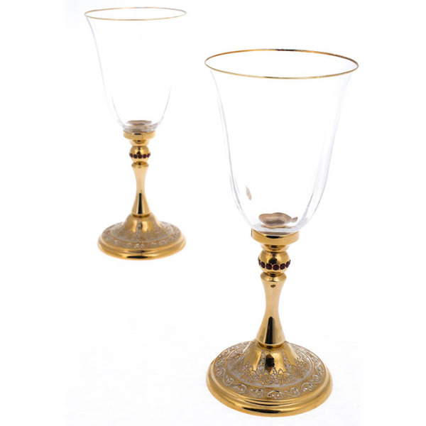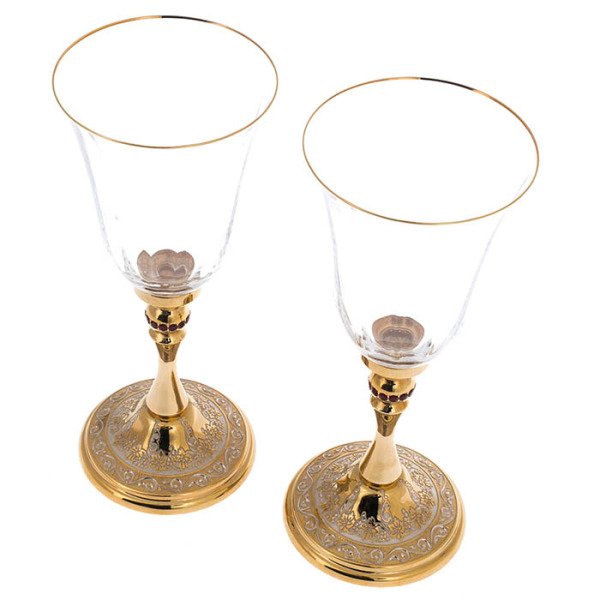 Стебель и основание бокалов — произведение ювелирного мастерства, созданное в технике златоустовской гравюры. Позолоченная ножка, украшенная сияющими кристаллами, словно отражает отблески свечей, а изящный орнамент с виноградной лозой символизирует плодородие, изобилие и долголетие. Это не просто украшение — это знак достатка, силы и умения наслаждаться каждым мгновением жизни.