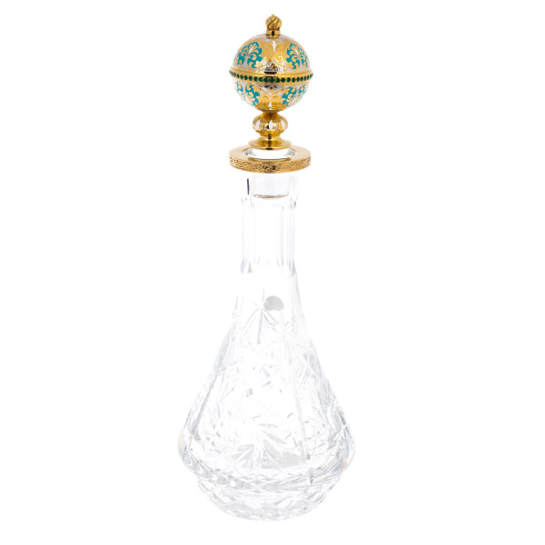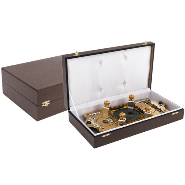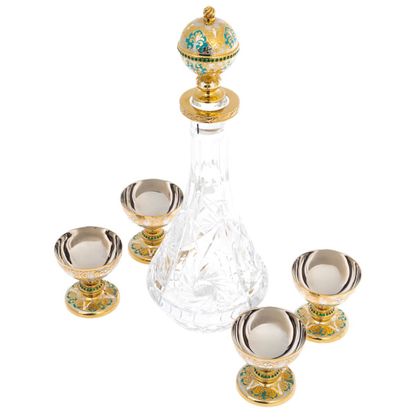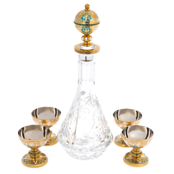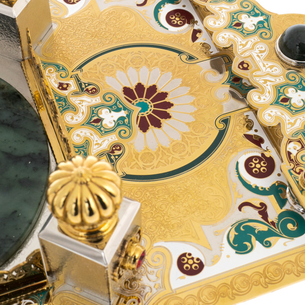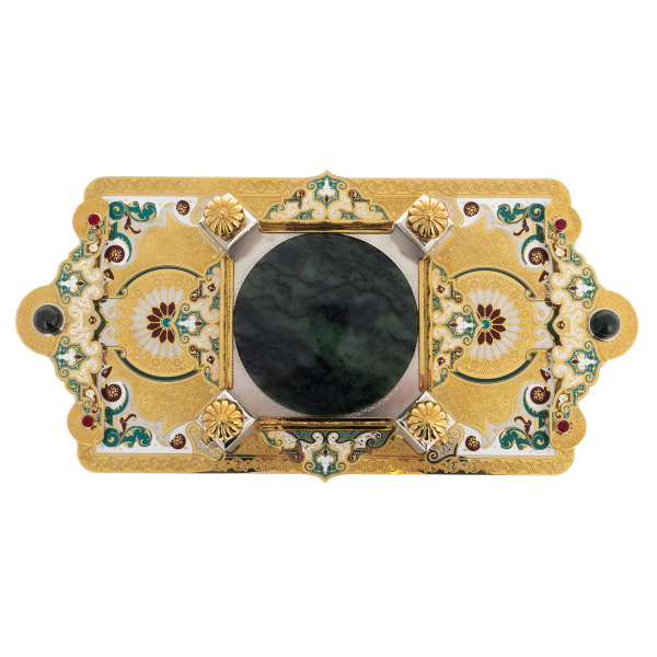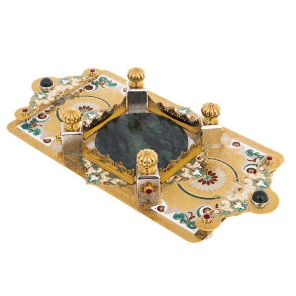Набор для вина на 4 персоны из Златоуста — произведение, в котором каждый элемент несёт черты императорского стиля, соединяя в себе торжественность, изящество и символику власти. Центром композиции выступает гранёный графин с массивной пробкой, увенчанной эмалированной короной в восточном стиле. Его окружают четыре кубка-чарки с золочёными ножками, украшенными витиеватым орнаментом, цветными эмалями и вставками зелёных кристаллов. Всё это располагается на подносе с мозаичным орнаментом, в центре которого расположен массив нефрита, обрамлённый четырьмя колоннами с венчающими навершиями. Глубокий цвет камня и насыщенные краски фона рождают ассоциации с восточным дворцом или драгоценным ковром, раскинутым под винным ритуалом.
