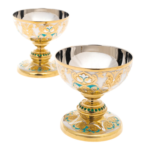 Мастера Златоуста использовали весь арсенал художественных техник: гравюру по металлу, сусальное золото, горячую эмаль, резьбу, полировку, инкрустацию камнями. Поднос и ножки кубков покрыты тончайшими растительными мотивами, выполненными в серебре и золоте, с вкраплениями алого, зелёного и бирюзового — цветовой палитрой, отсылающей к великокняжеским покоям и церемониальным трапезам. Детали — от венцов на колоннах до огранки хрусталя — требуют не просто навыка, а ювелирной точности, делающей каждое изделие уникальным.