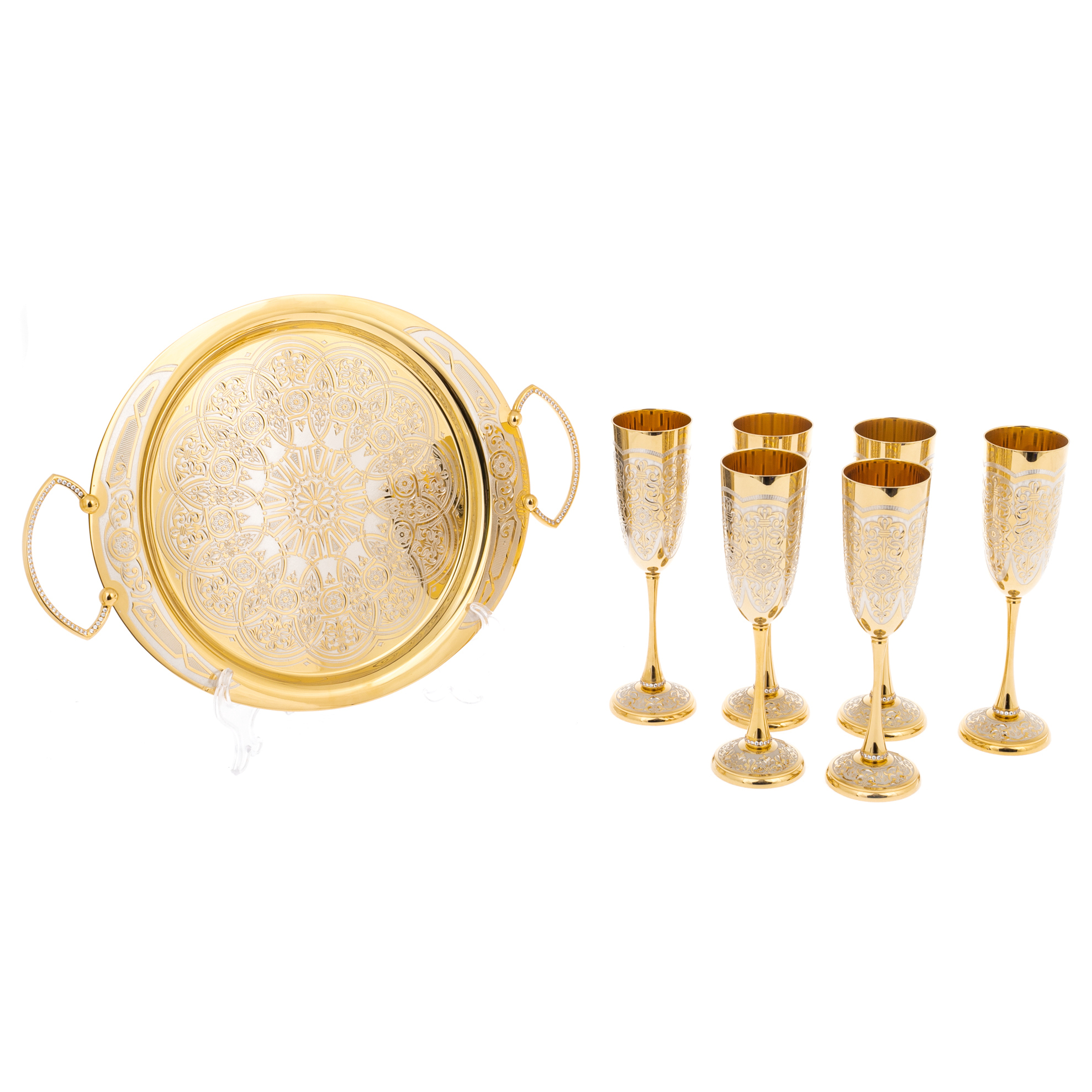 Набор для вина «Рассвет» включает в себя шесть высоких бокалов на тонкой ножке, поднос с двумя изящными ручками, подставка и декоративная пробка для бутылки. Каждая деталь поражает точностью исполнения и выверенной эстетикой — внутренняя поверхность сияет зеркальной полировкой, а снаружи металл покрыт орнаментом, тончайшим по рисунку и объемным по восприятию. Контраст золотых и серебристых оттенков подчеркивает рельеф гравировки, рождая ощущение торжественного сияния. Тонкие ножки бокалов придают всей композиции вертикальную лёгкость, в то время как массивный поднос придаёт ансамблю статичность и завершённость. Подарочная упаковка — два лакированных футляра из дерева с золотистой фурнитурой — завершает образ.