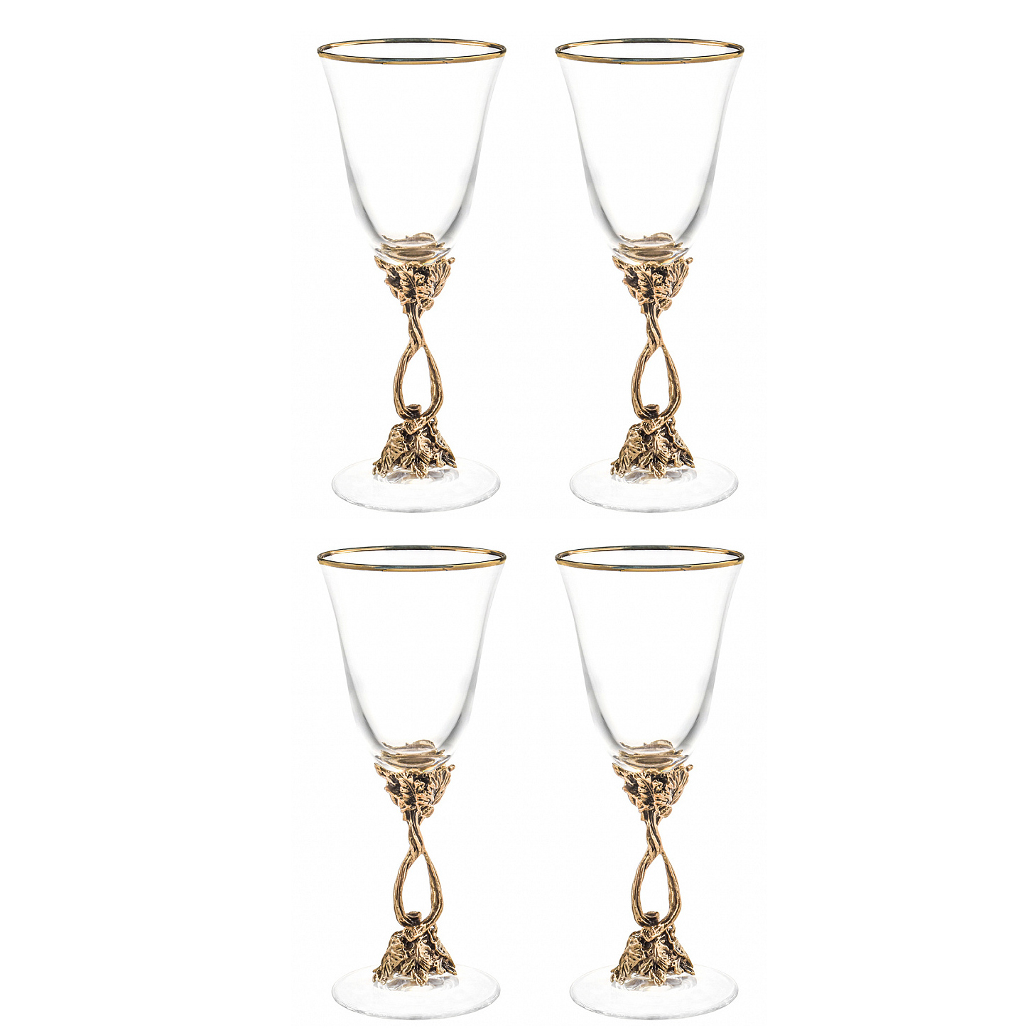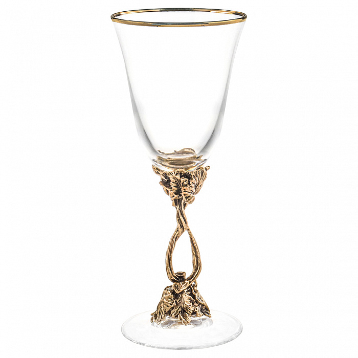 Набор бокалов для вина «Романтик» на четыре персоны — воплощение изящества, застывшего в стекле и патинированной латуни. Каждый бокал словно рождён из ветви лозы, вылепленной рукой художника: тонкая ножка из латуни поднимается плавной линией, скрученной в нежный виток, и венчается резным узором виноградных листьев, будто тронутых осенним золотом. Чаша из утончённого стекла оторочена изысканным ободком, сияющим в тон металлу, — границей, за которой начинается ритуал вкуса.