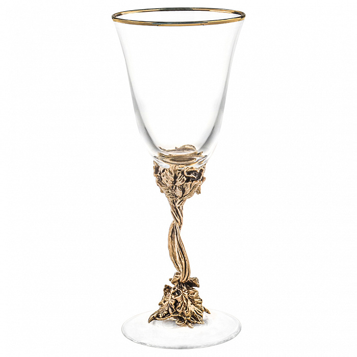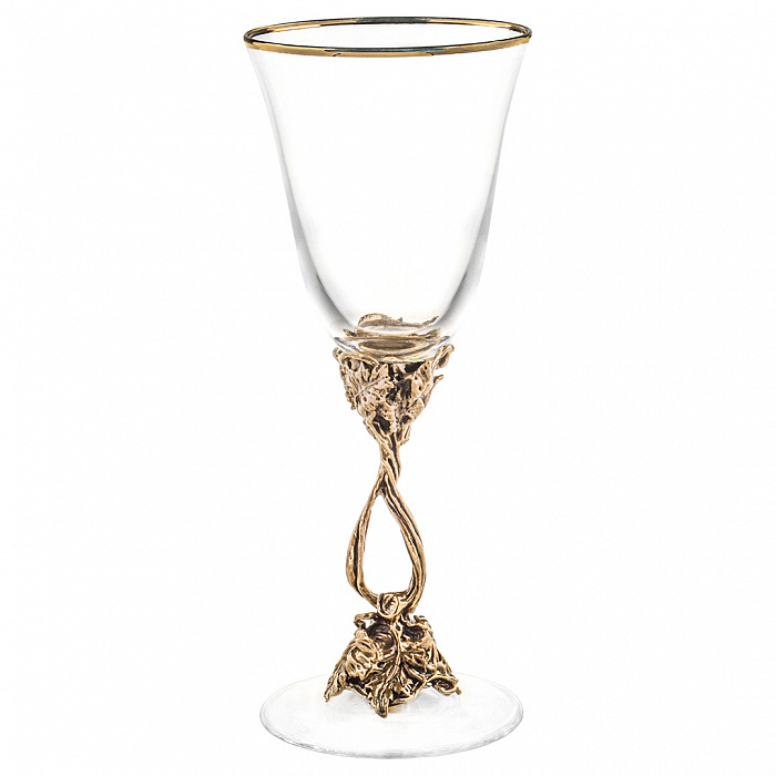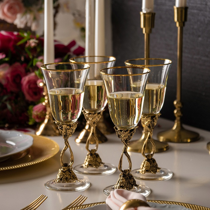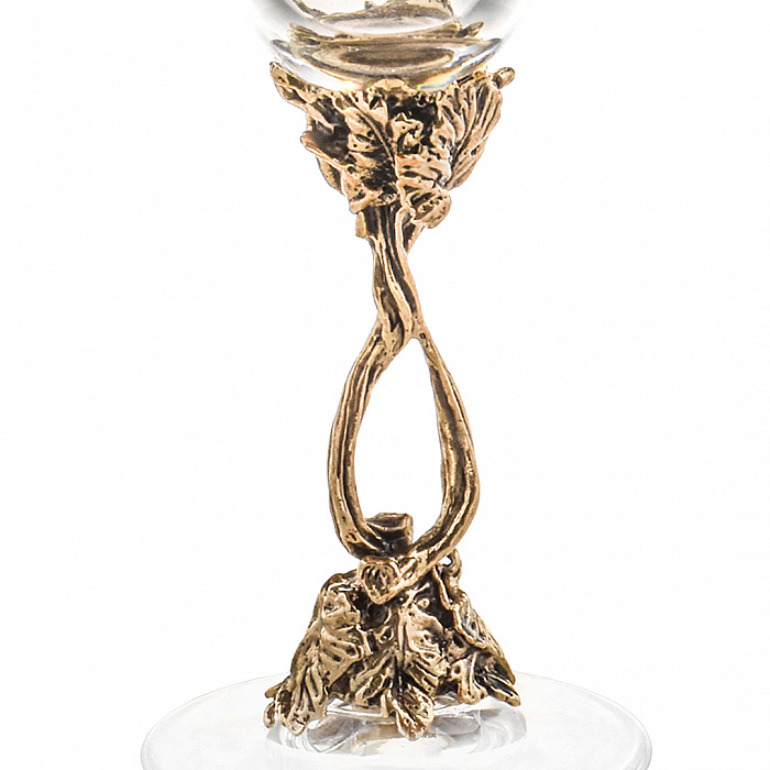 Латунные элементы бокалов отлиты вручную, патинированы и отполированы до мягкого благородного блеска. Рельеф основания украшен резными листьями и гроздьями винограда, отражающими культуру застолья как искусства. Баланс между весом металла и хрупкостью стекла передаёт главное — уважение к традиции и стремление к совершенству в каждой детали. Бокалы приятно ложатся в руку, а их изогнутый силуэт направляет аромат вина точно к центру наслаждения.