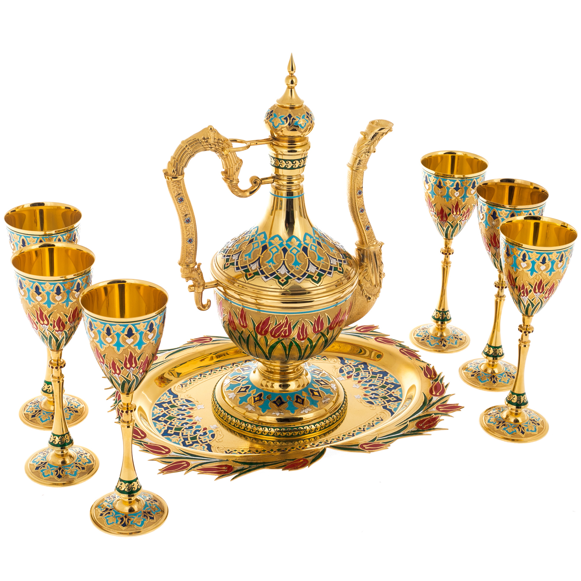 Златоустовский набор для вина придаст королевского шарма сервировке даже самого простого стола. Все предметы набора украшены традиционным красивым арабским узором, подчёркивающим сказочность этого сувенирного подарка.