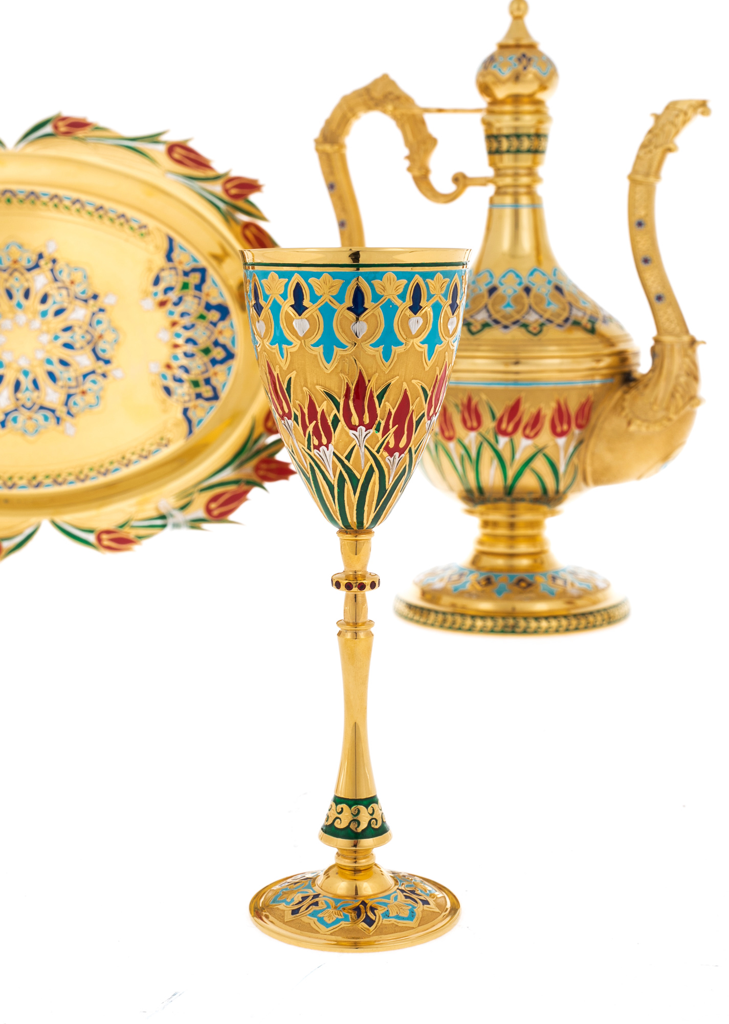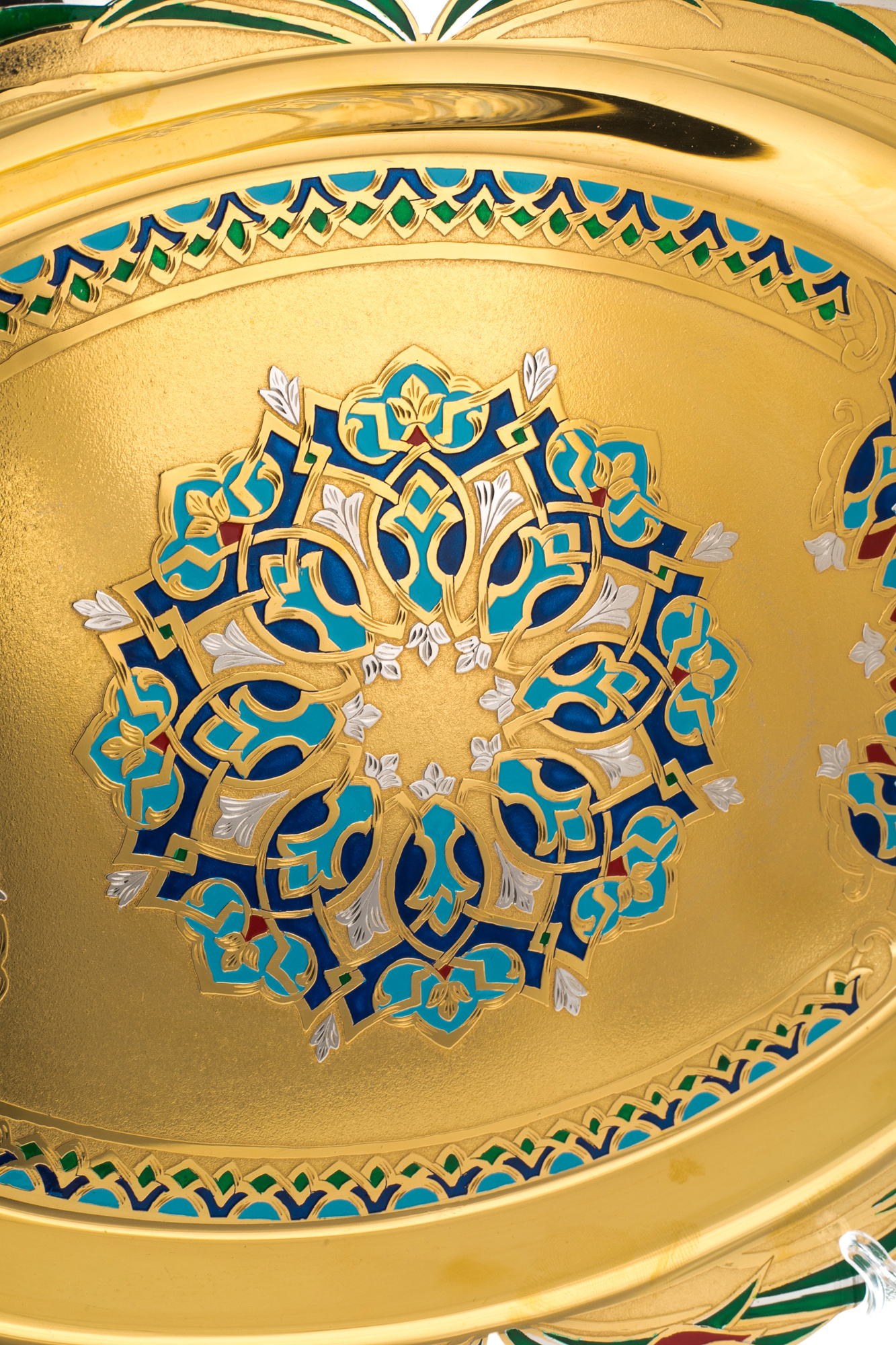 Коллекции изящной посуды от мастеров из Златоуста эффектно декорированы росписью, травлением и золочением. После того, как на полированную поверхность наносится изящный рисунок, изделие сушится в печи и подвергается обработке, после которого рисунок становится рельефным.