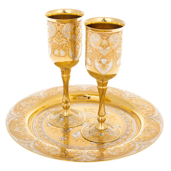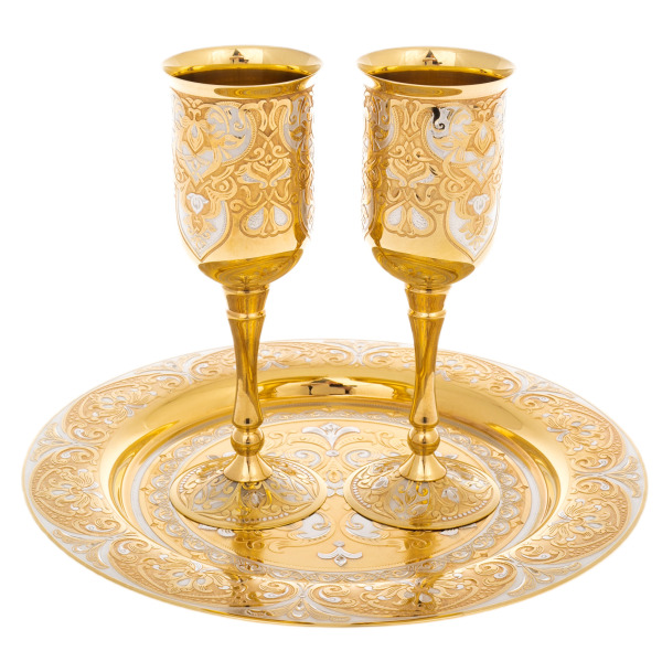 Набор для вина, выполненный в златоустовской технике, представляет собой изысканное сочетание функциональности и художественного мастерства, являясь настоящим украшением любого стола. Набор включает два бокала и поднос, каждый из которых украшен утончённой гравировкой, выполненной вручную. Основной фон изделий покрыт золотым узором, придающим набору особую глубину и благородство. Золотистые оттенки, используемые в гравировке, делают набор ещё более привлекательным. Каждый элемент набора, будь то изящный узор на бокалах или утончённые ручки, выполнен с безупречным вниманием к деталям, демонстрируя высочайший уровень мастерства.