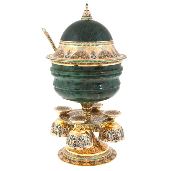 Основной акцент сделан на чаше, выполненной из натурального нефрита — камня, веками символизировавшего силу и бессмертие. Его насыщенный зелёный цвет, оттеняемый изысканными золотыми орнаментами, напоминает о богатстве природы и непостижимой глубине лесов. Вечное сияние нефрита, кажется, притягивает взгляд, наполняя душу чувством абсолютного превосходства.
