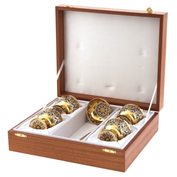 Для оформления использована техника перегородчатой эмали — одна из самых трудоёмких в декоративно-прикладном искусстве. Каждая линия, изгиб и точка на поверхности создаются вручную из золотой проволоки, формируя замкнутые ячейки. Эти пространства заполняются эмалью, проходящей несколько циклов обжига, чтобы добиться идеально гладкой, яркой и стойкой поверхности. Композиция усложняется за счёт рельефных золотистых акцентов, которые добавляют фактурности и блеска, играя на свету. На подносе элементы орнамента образуют симметричную мандалу, завершая художественный замысел сервиза.