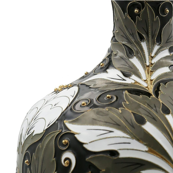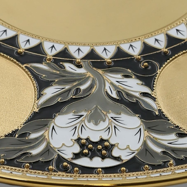 Художественная техника перегородчатой эмали требует от мастера безупречной точности и художественного чутья. Каждый элемент орнамента обрамляется тонкой золотой проволокой, заполняется эмалевыми красками и многократно обжигается до достижения насыщенного, стойкого цвета. Этот процесс превращает металлическую поверхность в живописное полотно, где каждый виноградный лист отлит с ювелирной проработкой. Переливы эмали и золотистые акценты создают рельеф и объём, делая узор ощутимо живым и осязаемым. Композиция рождает ощущение старинной европейской утвари, передающей атмосферу богатства и знатности.