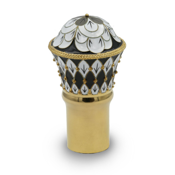 Для оформления использована техника перегородчатой эмали — одна из самых трудоёмких в декоративно-прикладном искусстве. Каждая линия, изгиб и точка на поверхности создаются вручную из золотой проволоки, формируя замкнутые ячейки. Эти пространства заполняются эмалью, проходящей несколько циклов обжига, чтобы добиться идеально гладкой, яркой и стойкой поверхности. Композиция усложняется за счёт рельефных золотистых акцентов, которые добавляют фактурности и блеска, играя на свету. На подносе элементы орнамента образуют симметричную мандалу, завершая художественный замысел сервиза.