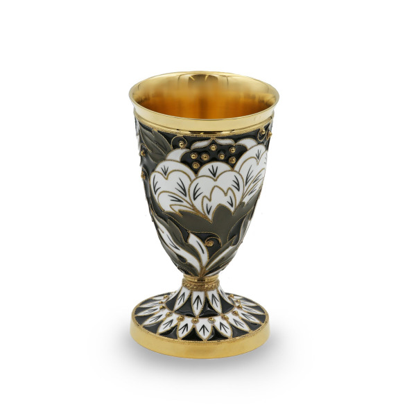 Набор для вина «Пион» — это подлинный образец декоративного торжества, в котором древнее ремесло достигает уровня высокой ювелирной культуры. Комплект состоит из изящного графина с фигурной крышкой, шести бокалов и сервировочного подноса. Каждая деталь выполнена из металла с благородным матовым сиянием и покрыта сложным флористическим орнаментом, вдохновлённым символикой пиона — цветка царственного достоинства, долголетия и любви. Белоснежные лепестки, графитовые листья, золотые прожилки и тонкие чёрные штрихи создают объёмный и выразительный рисунок, будто оживающий на бархатистом фоне.