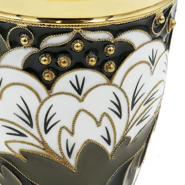 Декор нанесён в технике перегородчатой эмали, где каждая линия формируется вручную тонкой проволокой и заполняется цветной эмалью, проходящей многократный обжиг. Этот процесс требует высочайшего мастерства и даёт неповторимый результат — глянцевую, объёмную, рельефную поверхность с невероятной стойкостью. Орнамент подчёркнут чёткими ритмами и контрастами, а обрамляющие элементы создают ощущение визуальной игры, словно предмет сам вовлекает в мир азарта и случая. Даже сервировочный поднос с декоративными ячейками под бокалы оформлен так, будто принадлежит к инвентарю изысканного казино времён ар-деко.