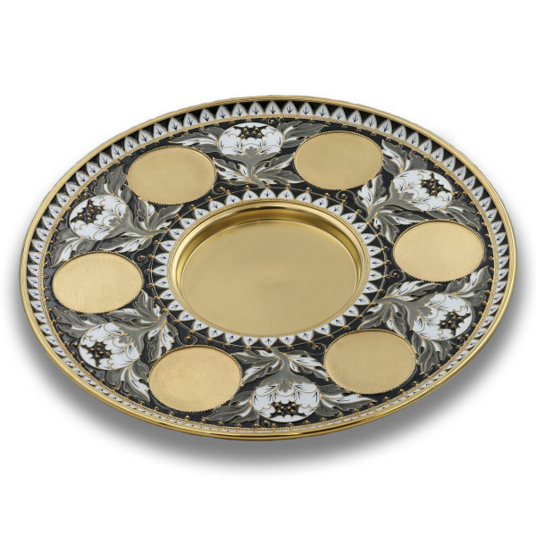 Ключевым художественным приёмом оформления служит эмалево-филигранная техника, сочетающая тончайшую ювелирную проволоку и прозрачные слои горячей эмали. Орнамент выкладывается вручную из скрученных золотых нитей, формирующих изысканные контуры цветов и листьев. Внутри этих контуров мастера наносят живописные оттенки эмали — от насыщенного лазурного до мягкого розово-бордового. Эмаль заполняет пространство густым цветом, а после обжига обретает характерный глянец, преломляющий свет на поверхности изделия. В результате получаются не просто узоры, а полноценные рельефные миниатюры — живые, глубокие, наполненные дыханием природы и художественной точностью.