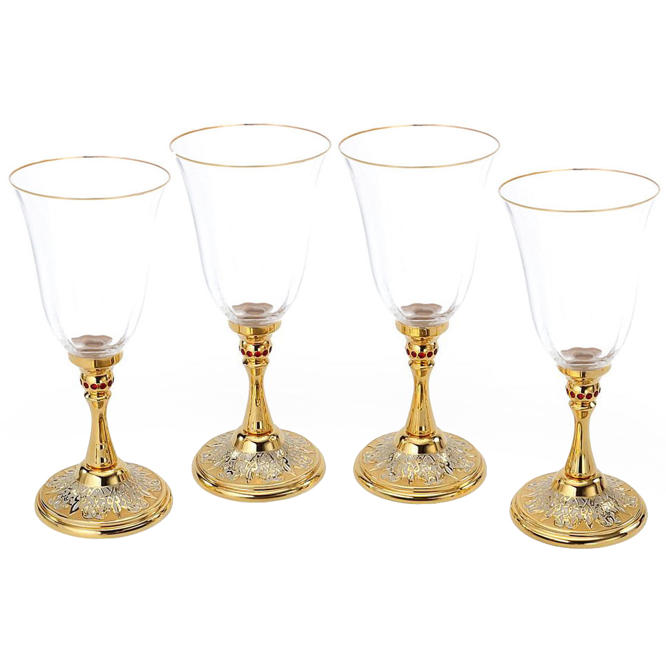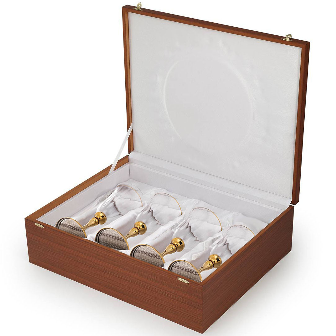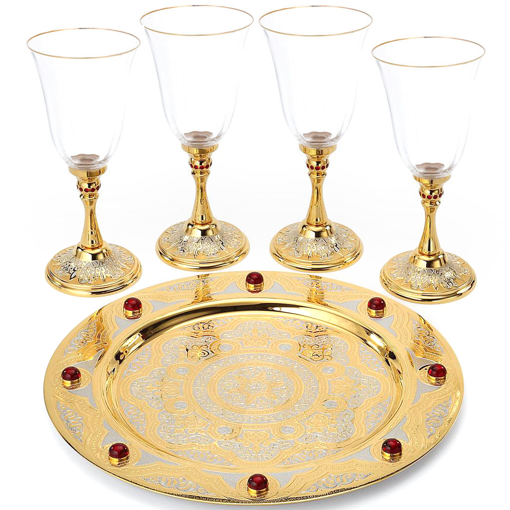Винный набор «Гранат» — изысканное произведение златоустовских мастеров, созданное для особых моментов, когда вкус напитка сливается с эстетикой подачи. В его составе — четыре элегантных бокала и роскошное блюдо, объединившие благородные формы, сияние золота и утончённость ручной работы. Стеклянные чаши бокалов венчают ножки из латуни с золотым покрытием, украшенные филигранным гравированным орнаментом и инкрустацией красными фианитами, мерцающими теплом драгоценных камней.