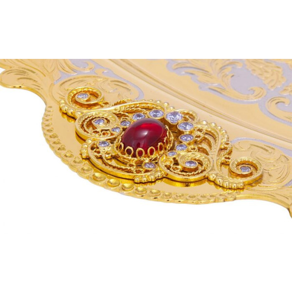 Для оформления использована техника перегородчатой эмали — одна из самых трудоёмких в декоративно-прикладном искусстве. Каждая линия, изгиб и точка на поверхности создаются вручную из золотой проволоки, формируя замкнутые ячейки. Эти пространства заполняются эмалью, проходящей несколько циклов обжига, чтобы добиться идеально гладкой, яркой и стойкой поверхности. Композиция усложняется за счёт рельефных золотистых акцентов, которые добавляют фактурности и блеска, играя на свету. На подносе элементы орнамента образуют симметричную мандалу, завершая художественный замысел сервиза.