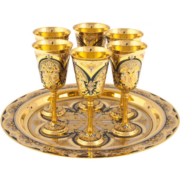 Набор для вина "Ваше величество" на 6 персон, ЗлатоустНабор для вина "Ваше величество" на 6 персон, ЗлатоустКоллекции изящной посуды от мастеров из Златоуста эффектно декорированы росписью, травлением и золочением. После того, как на полированную поверхность наносится изящный рисунок, изделие сушится в печи и подвергается обработке, после которого рисунок становится рельефным.