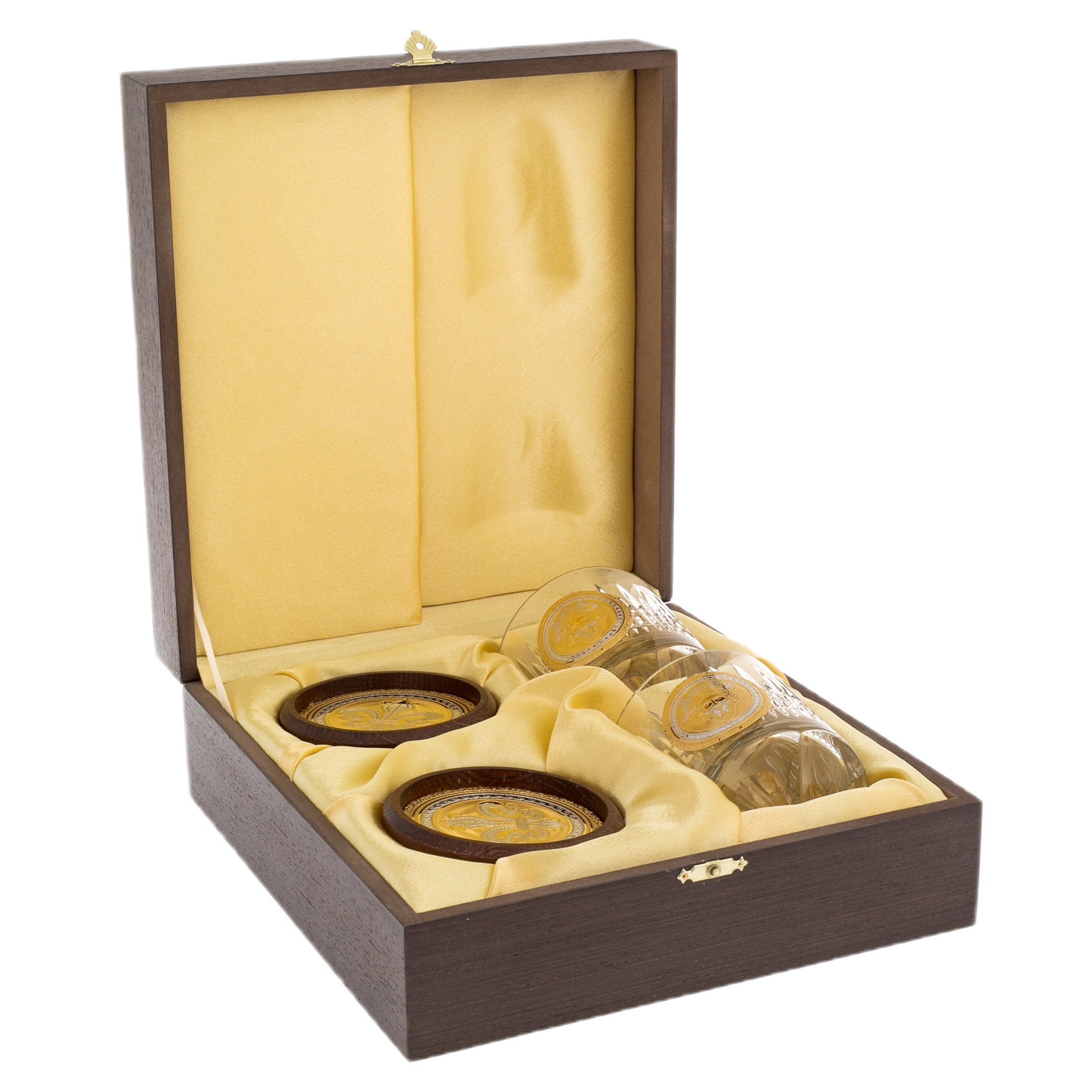 АльтмастерНабор стаканов для виски на 2 персоны "Быки"Набор стаканов для виски на 2 персоны "Быки"Каждый стакан, вмещающий 280 миллилитров, украшен плакеткой ручной работы. Стаканы упакованы в подарочный футляр и транспортную коробку.